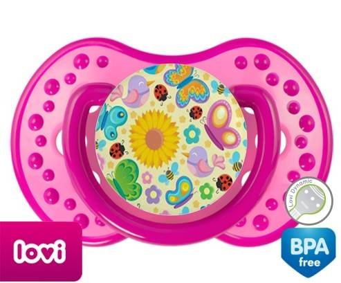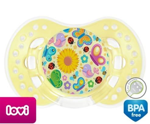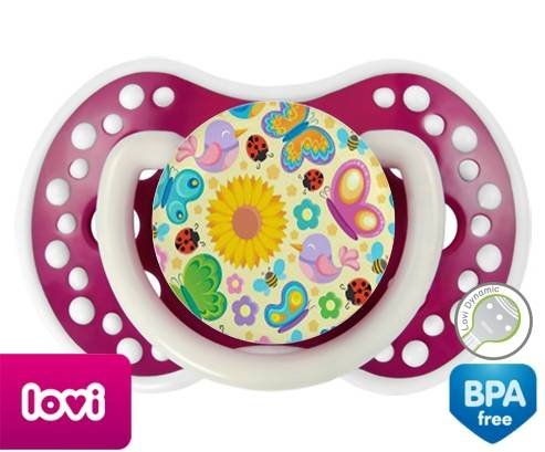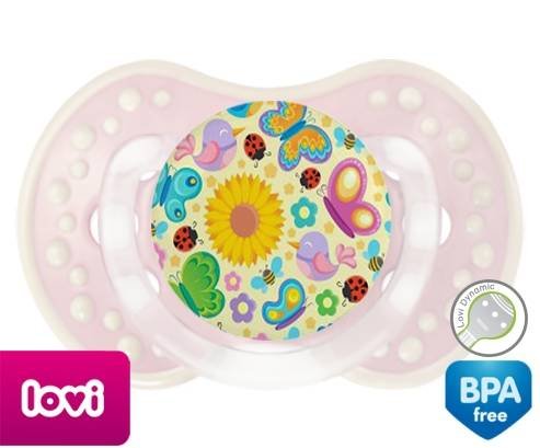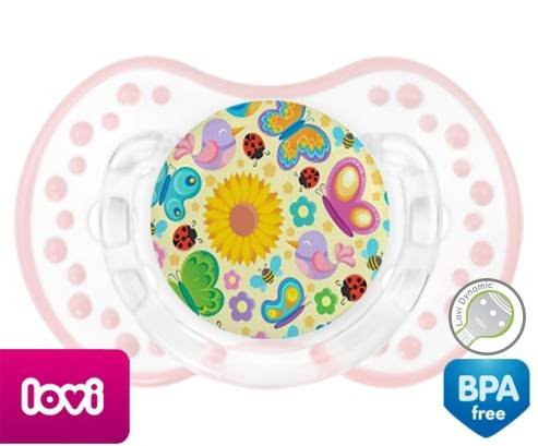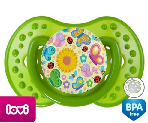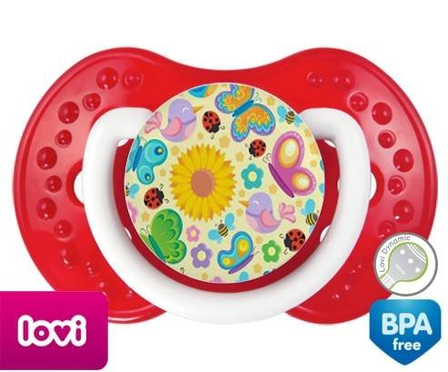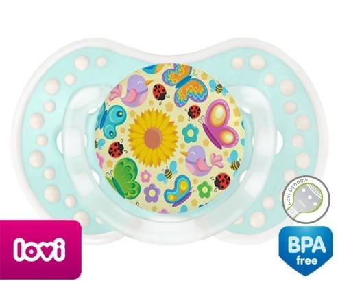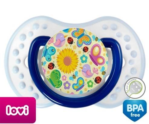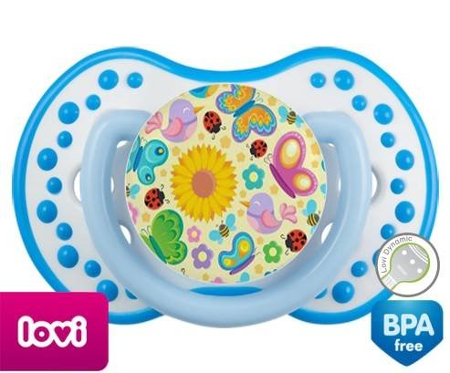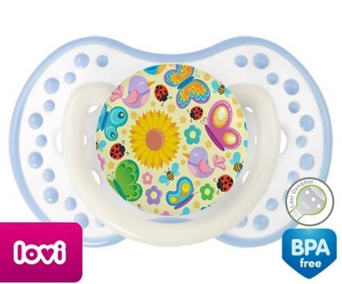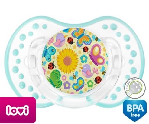 Tetine personnalisee pour bébé Animaux volants à embout LOVI Dynamic en silicone de la marque Lovi Dynamic avec impression en en Couleurs de la collection Design / Motif.La silicone se reconnaît par sa couleur transparente. C'est une matière souple, douce, sans goût ni odeur et offre à bébé une succion plus facile grâce à sa souplesse.