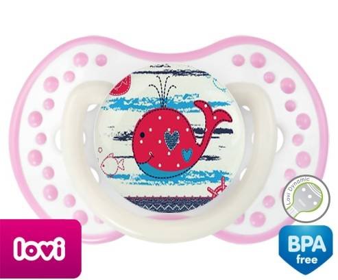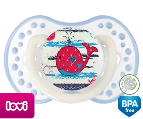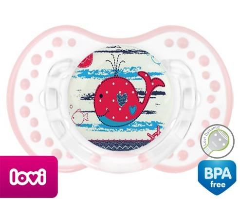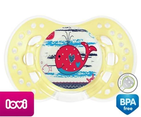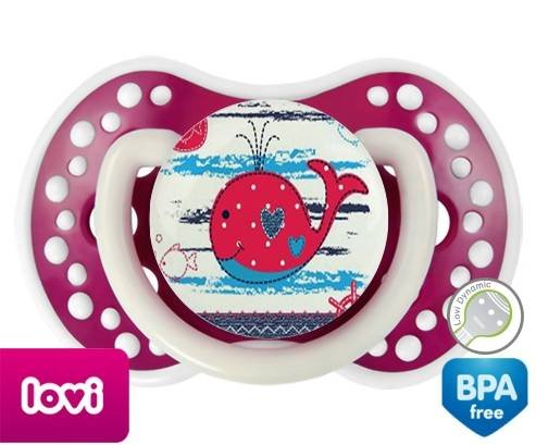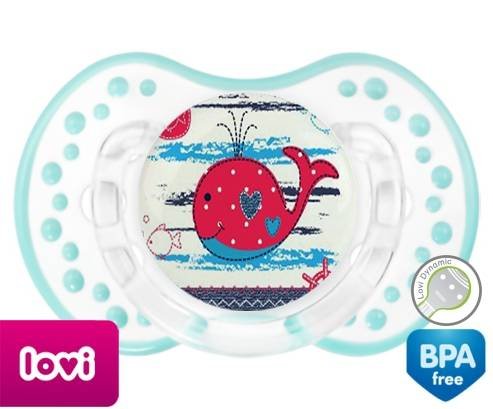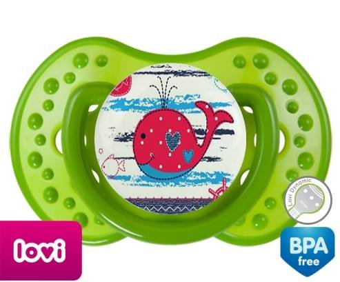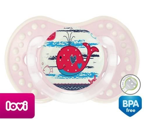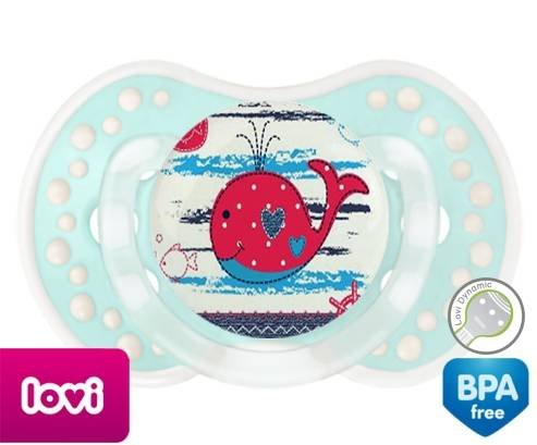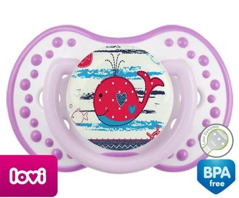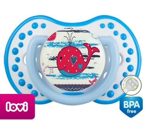 Sucette personnalisée pour bébé Baleine à embout LOVI Dynamic en silicone de la marque Lovi Dynamic avec impression en en Couleurs de la collection Design / Motif.La silicone se reconnaît par sa couleur transparente. C'est une matière souple, douce, sans goût ni odeur et offre à bébé une succion plus facile grâce à sa souplesse.