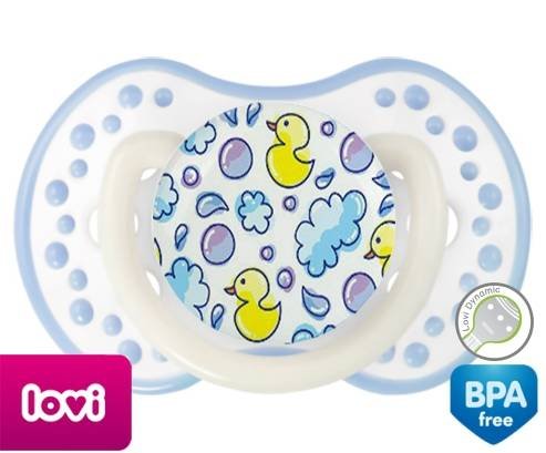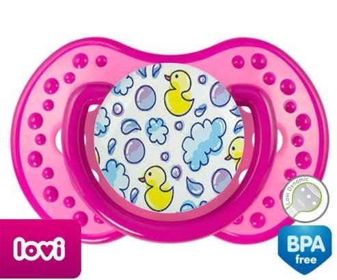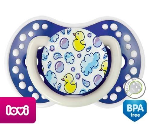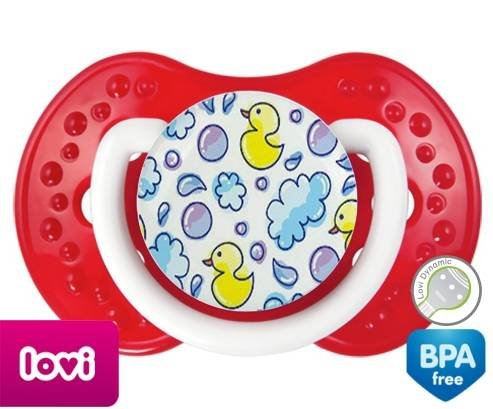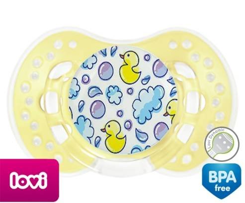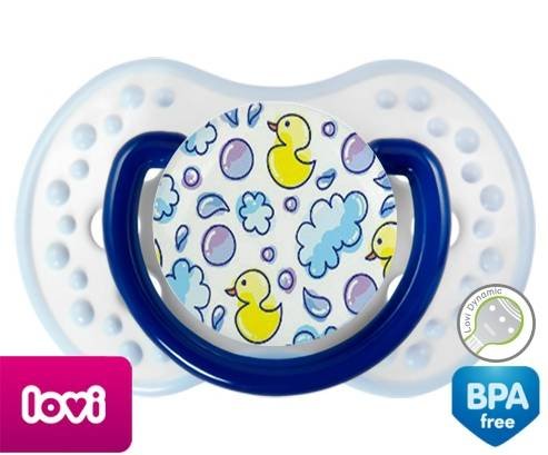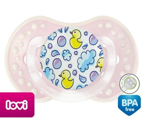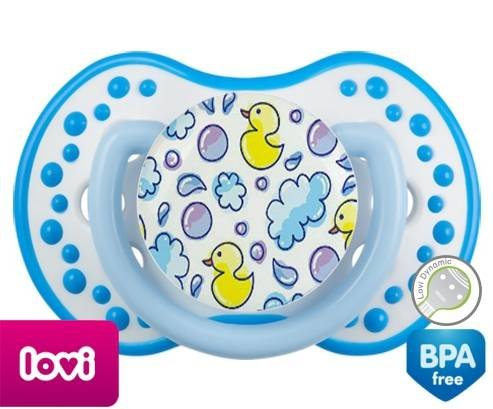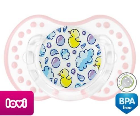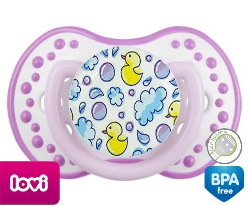 Tétine personnalisée pour bébé Canards à embout LOVI Dynamic en silicone de la marque Lovi Dynamic avec impression en en Couleurs de la collection Design / Motif.La silicone se reconnaît par sa couleur transparente. C'est une matière souple, douce, sans goût ni odeur et offre à bébé une succion plus facile grâce à sa souplesse.