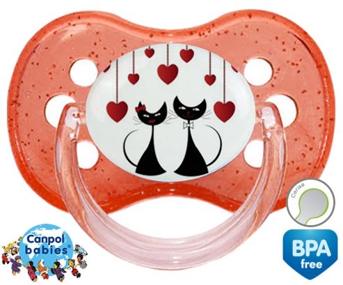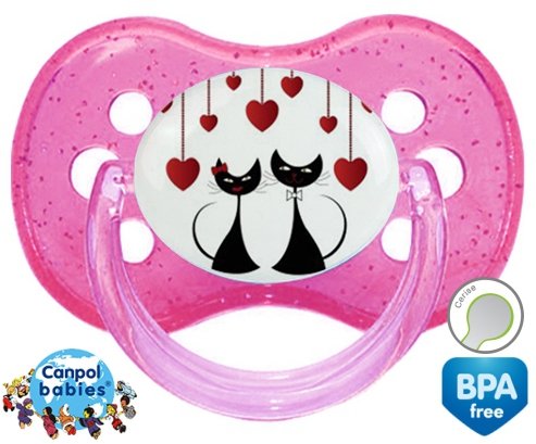Sucette personnalisée pour bébé Chats + cœurs à embout Cerise en silicone de la marque Canpol Babies avec impression en en Couleurs de la collection Design / Motif.La silicone se reconnaît par sa couleur transparente. C'est une matière souple, douce, sans goût ni odeur et offre à bébé une succion plus facile grâce à sa souplesse.