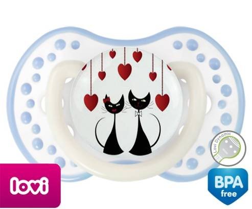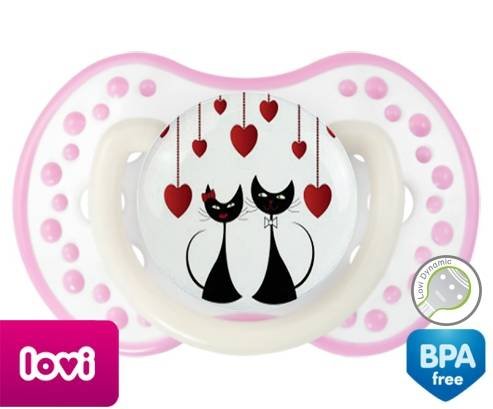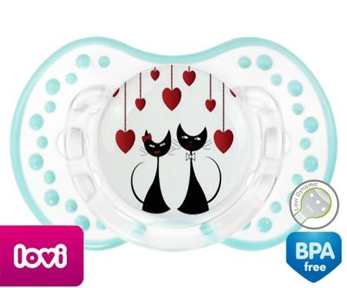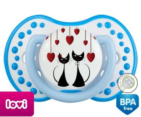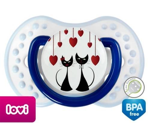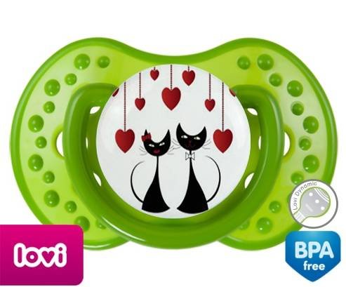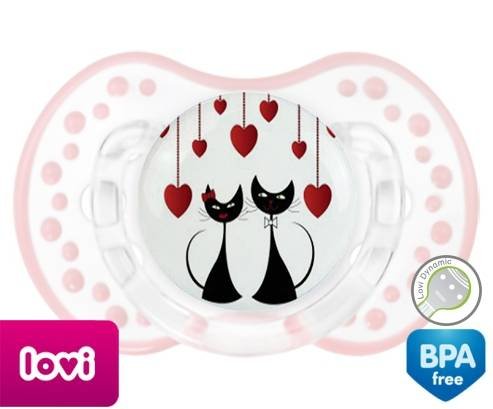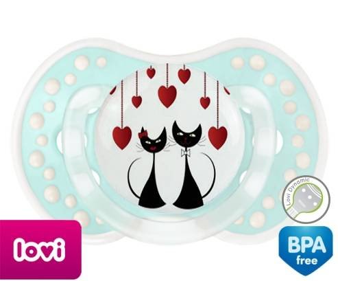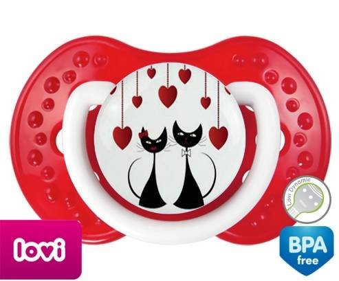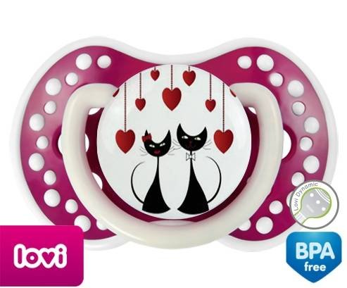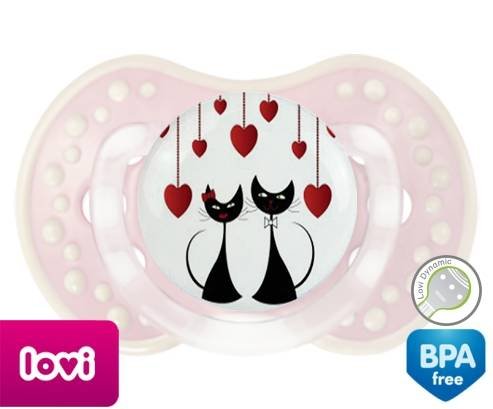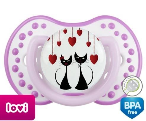 Tétine personnalisée pour bébé Chats + cœurs à embout LOVI Dynamic en silicone de la marque Lovi Dynamic avec impression en en Couleurs de la collection Design / Motif.La silicone se reconnaît par sa couleur transparente. C'est une matière souple, douce, sans goût ni odeur et offre à bébé une succion plus facile grâce à sa souplesse.