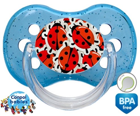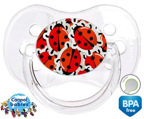 Sucette personnalisée pour bébé Coccinelles à embout Cerise en silicone de la marque Canpol Babies avec impression en en Couleurs de la collection Design / Motif.La silicone se reconnaît par sa couleur transparente. C'est une matière souple, douce, sans goût ni odeur et offre à bébé une succion plus facile grâce à sa souplesse.