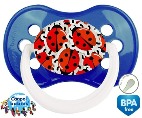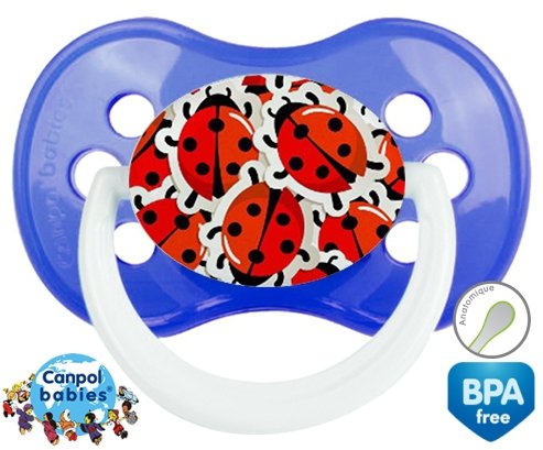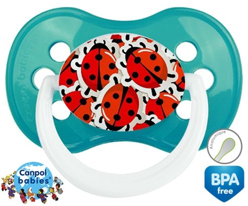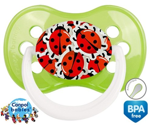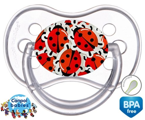 Tétine personnalisée pour bébé Coccinelles à embout Anatomique en silicone de la marque Canpol Babies avec impression en en Couleurs de la collection Design / Motif.La silicone se reconnaît par sa couleur transparente. C'est une matière souple, douce, sans goût ni odeur et offre à bébé une succion plus facile grâce à sa souplesse.