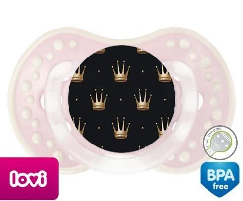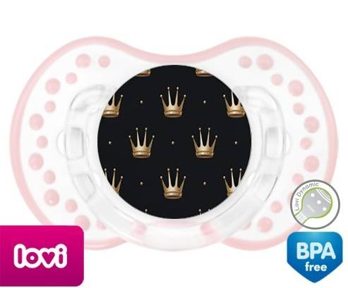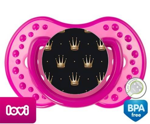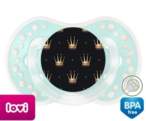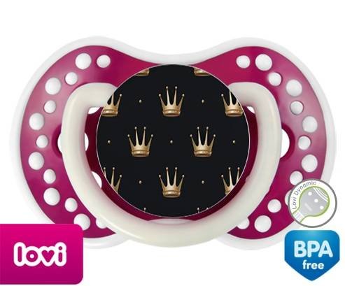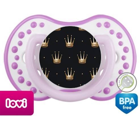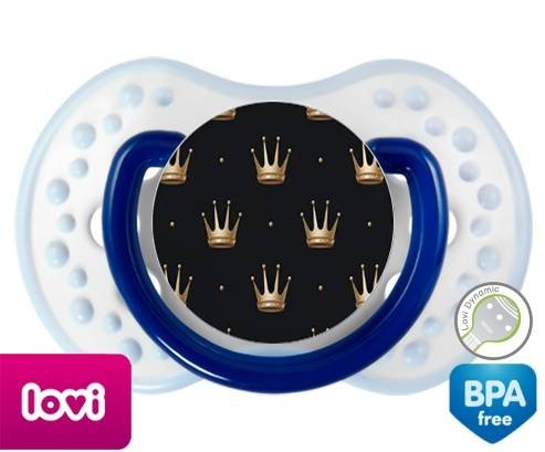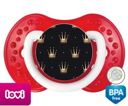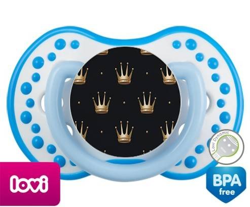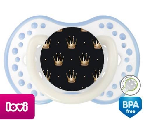Sucette personnalisée pour bébé Couronne doré à embout LOVI Dynamic en silicone de la marque Lovi Dynamic avec impression en en Couleurs de la collection Design / Motif.La silicone se reconnaît par sa couleur transparente. C'est une matière souple, douce, sans goût ni odeur et offre à bébé une succion plus facile grâce à sa souplesse.
