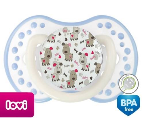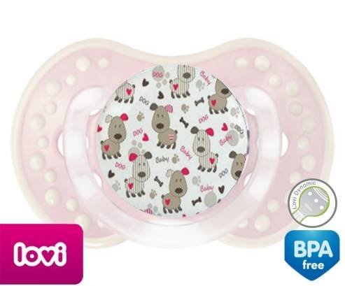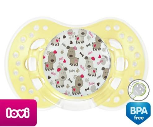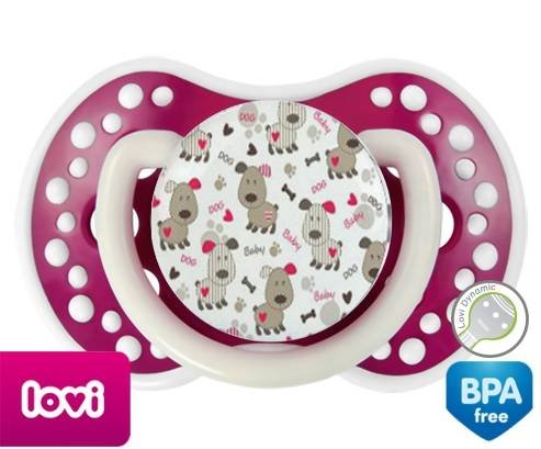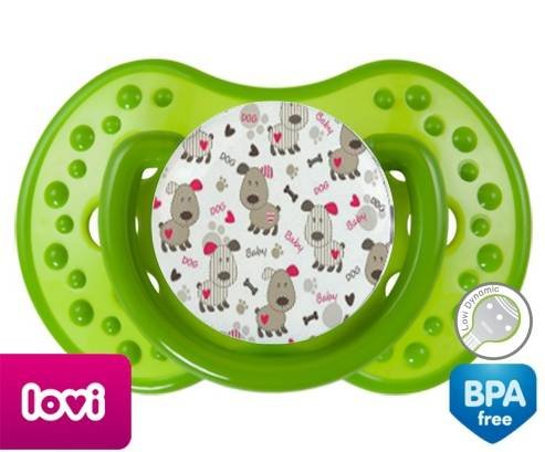 Sucette personnalisée pour bébé Dog à embout LOVI Dynamic en silicone de la marque Lovi Dynamic avec impression en en Couleurs de la collection Design / Motif.La silicone se reconnaît par sa couleur transparente. C'est une matière souple, douce, sans goût ni odeur et offre à bébé une succion plus facile grâce à sa souplesse.