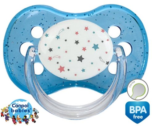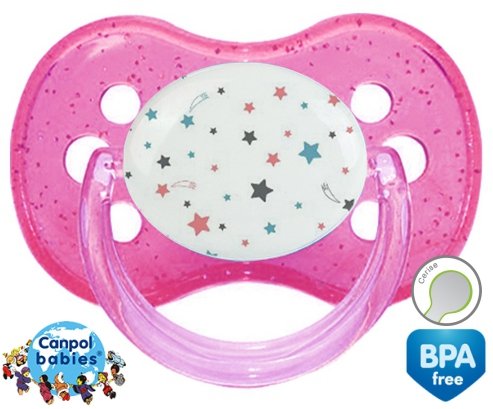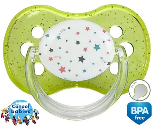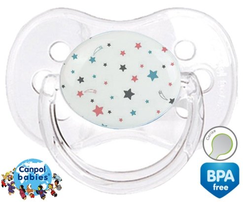 Tetine personnalisee pour bébé Etoiles à embout Cerise en silicone de la marque Canpol Babies avec impression en en Couleurs de la collection Design / Motif.La silicone se reconnaît par sa couleur transparente. C'est une matière souple, douce, sans goût ni odeur et offre à bébé une succion plus facile grâce à sa souplesse.