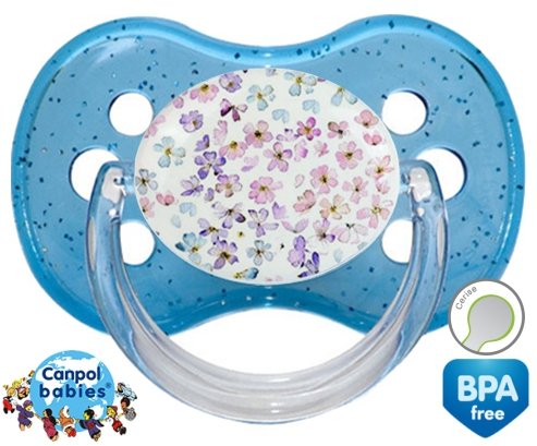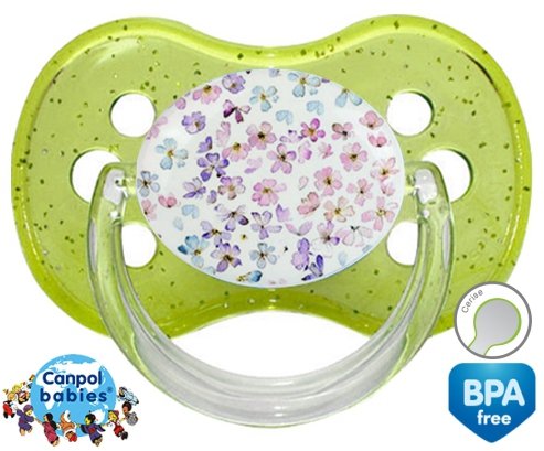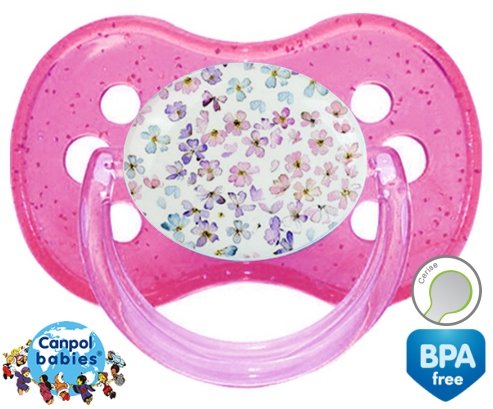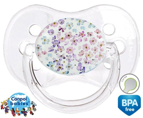 Sucette personnalisée pour bébé Florale à embout Cerise en silicone de la marque Canpol Babies avec impression en en Couleurs de la collection Design / Motif.La silicone se reconnaît par sa couleur transparente. C'est une matière souple, douce, sans goût ni odeur et offre à bébé une succion plus facile grâce à sa souplesse.