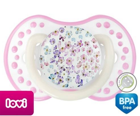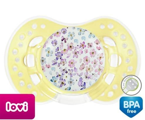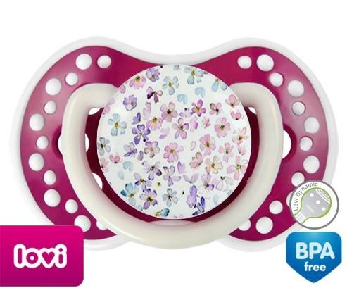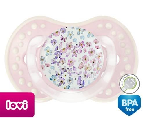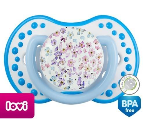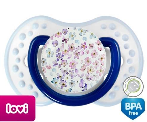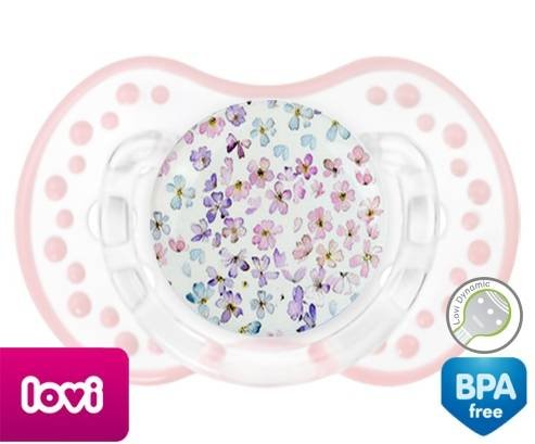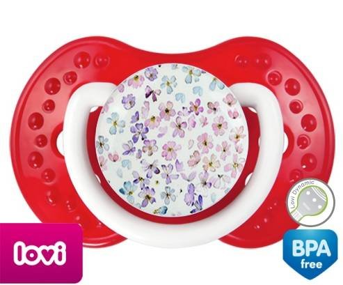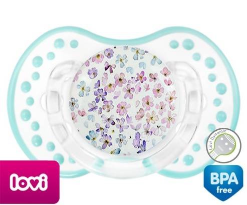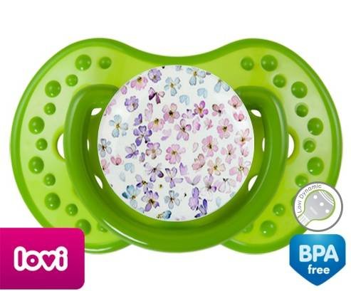 Sucette personnalisée pour bébé Florale à embout LOVI Dynamic en silicone de la marque Lovi Dynamic avec impression en en Couleurs de la collection Design / Motif.La silicone se reconnaît par sa couleur transparente. C'est une matière souple, douce, sans goût ni odeur et offre à bébé une succion plus facile grâce à sa souplesse.
