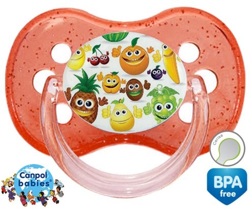 Sucette personnalisée pour bébé Fruits à embout Cerise en silicone de la marque Canpol Babies avec impression en en Couleurs de la collection Design / Motif.La silicone se reconnaît par sa couleur transparente. C'est une matière souple, douce, sans goût ni odeur et offre à bébé une succion plus facile grâce à sa souplesse.