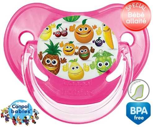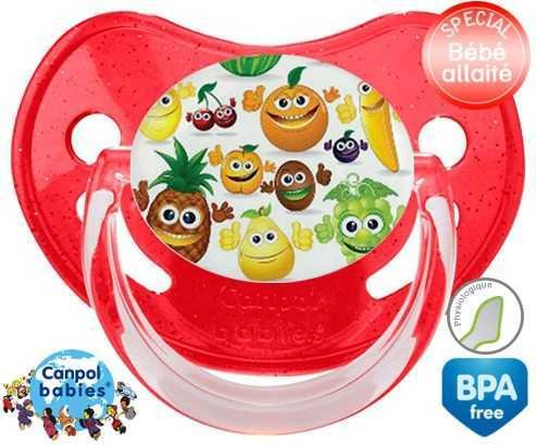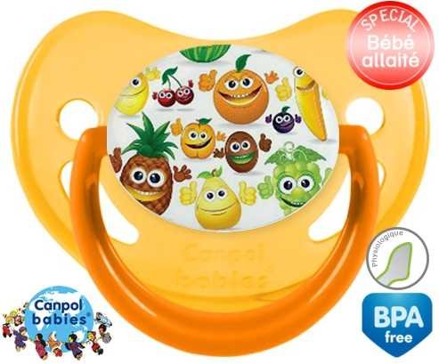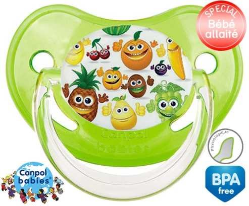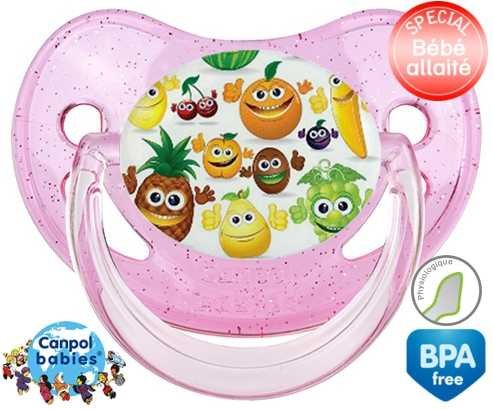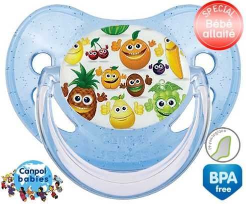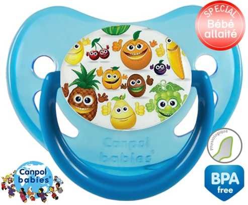 Tétine personnalisée pour bébé Fruits à embout Physiologique en silicone de la marque Canpol Babies avec impression en en Couleurs de la collection Design / Motif.La silicone se reconnaît par sa couleur transparente. C'est une matière souple, douce, sans goût ni odeur et offre à bébé une succion plus facile grâce à sa souplesse.