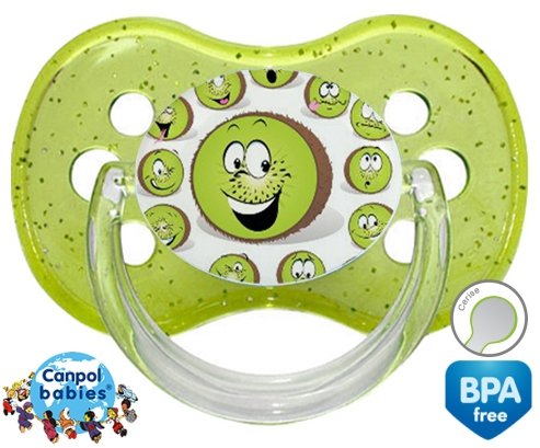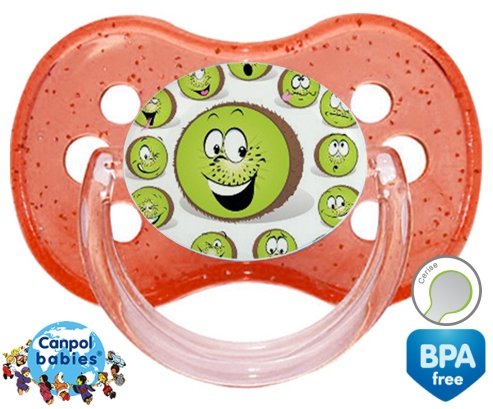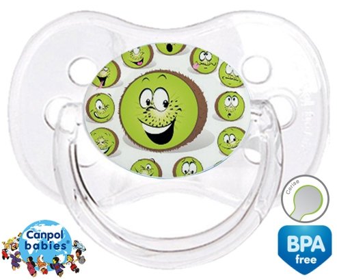 Sucette personnalisée pour bébé Kiwi à embout Cerise en silicone de la marque Canpol Babies avec impression en en Couleurs de la collection Design / Motif.La silicone se reconnaît par sa couleur transparente. C'est une matière souple, douce, sans goût ni odeur et offre à bébé une succion plus facile grâce à sa souplesse.