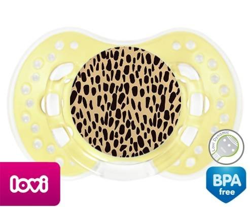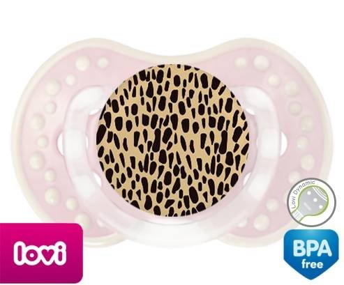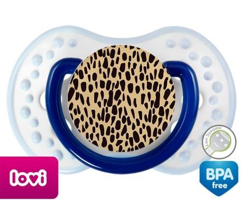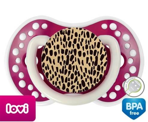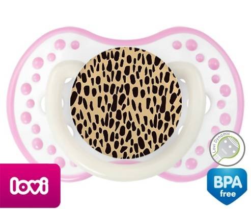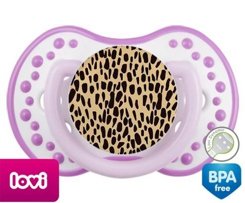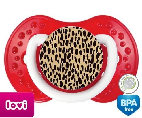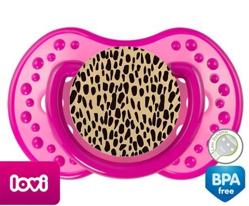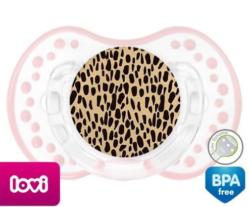 Sucette personnalisée pour bébé Léopard orange à embout LOVI Dynamic en silicone de la marque Lovi Dynamic avec impression en en Couleurs de la collection Design / Motif.La silicone se reconnaît par sa couleur transparente. C'est une matière souple, douce, sans goût ni odeur et offre à bébé une succion plus facile grâce à sa souplesse.