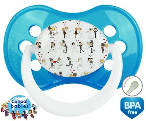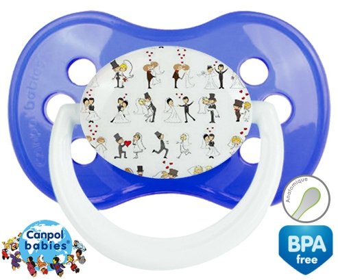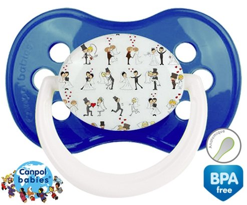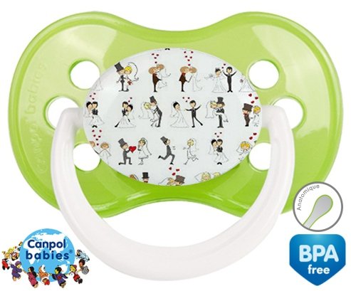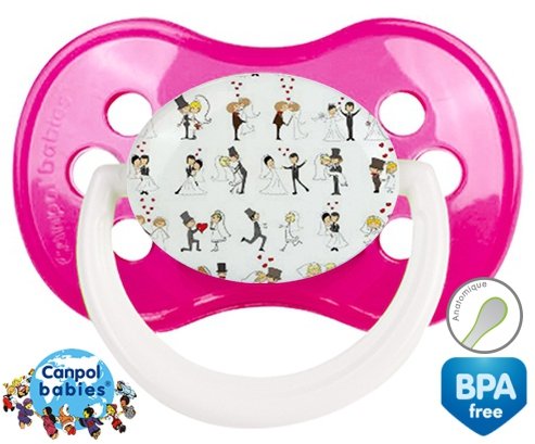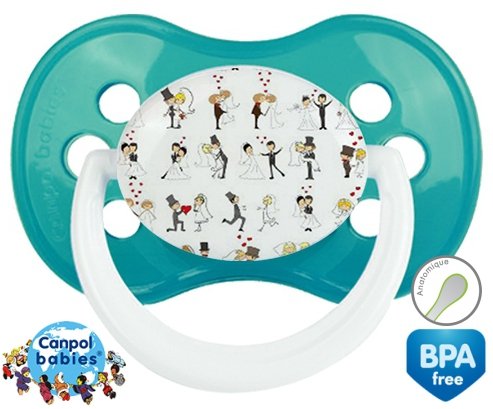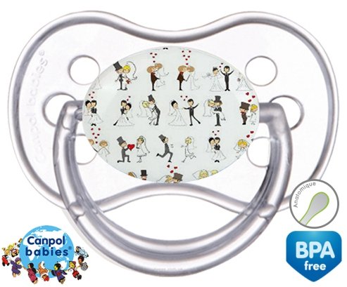 Sucette personnalisée pour bébé Mariage à embout Anatomique en silicone de la marque Canpol Babies avec impression en en Couleurs de la collection Design / Motif.La silicone se reconnaît par sa couleur transparente. C'est une matière souple, douce, sans goût ni odeur et offre à bébé une succion plus facile grâce à sa souplesse.