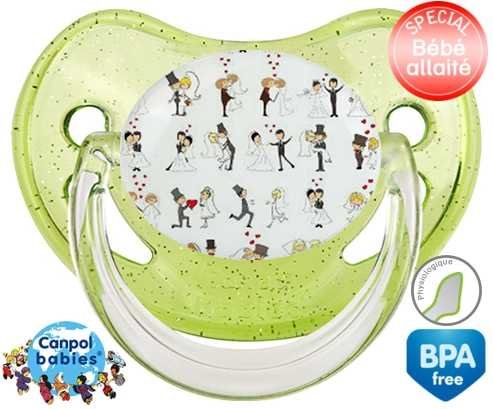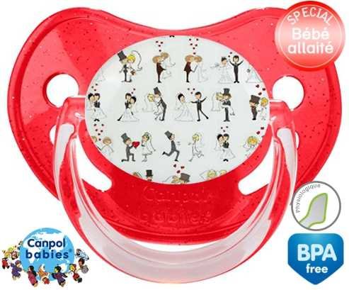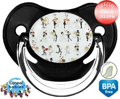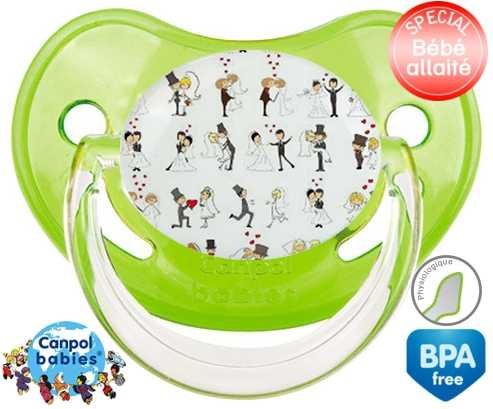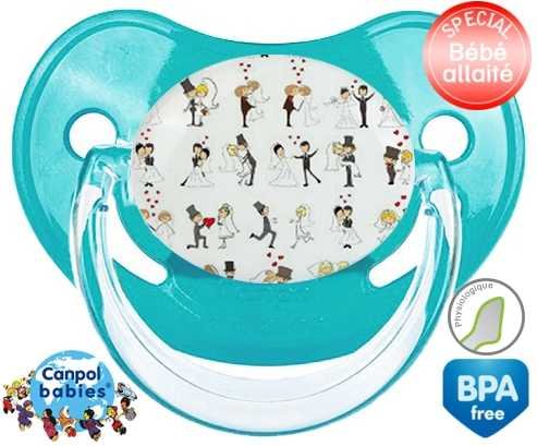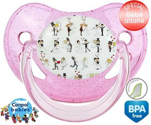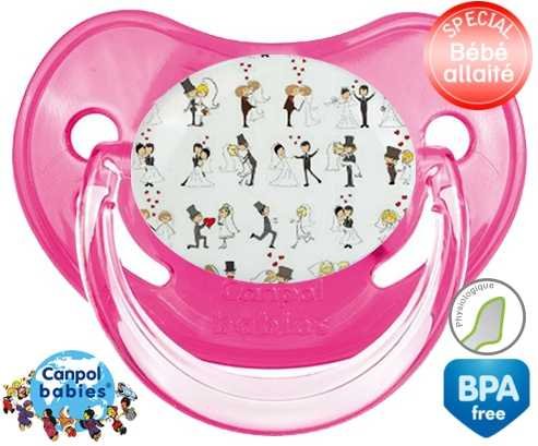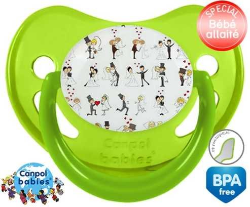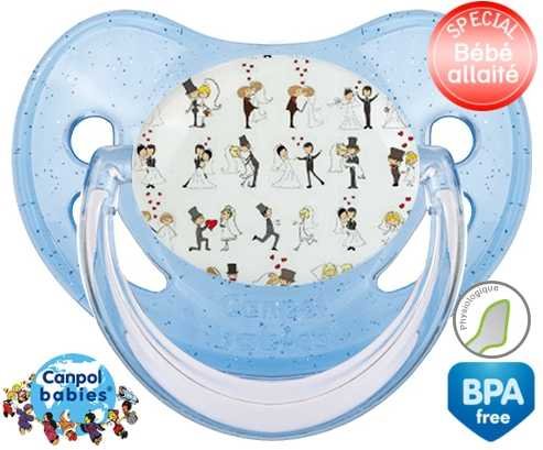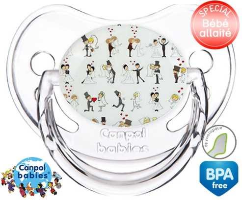 Tétine personnalisée pour bébé Mariage à embout Physiologique en silicone de la marque Canpol Babies avec impression en en Couleurs de la collection Design / Motif.La silicone se reconnaît par sa couleur transparente. C'est une matière souple, douce, sans goût ni odeur et offre à bébé une succion plus facile grâce à sa souplesse.