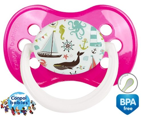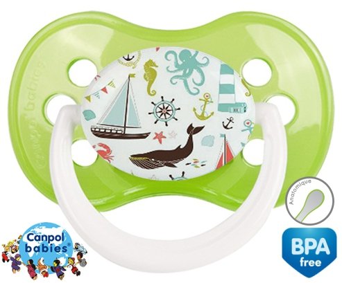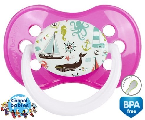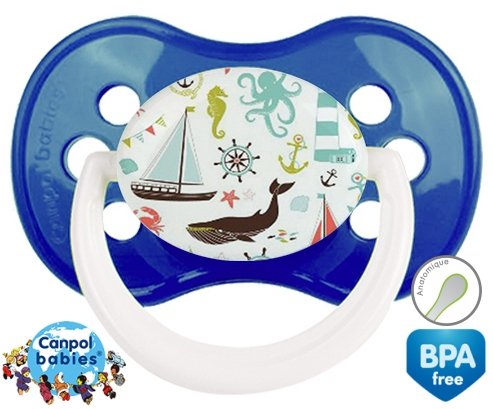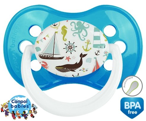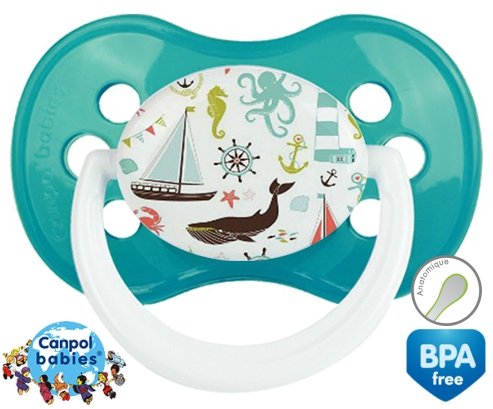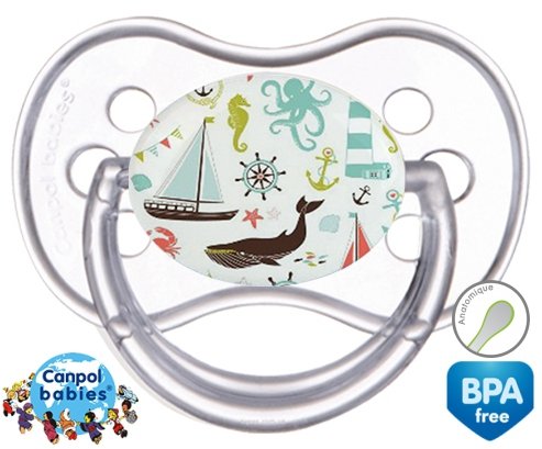 Tetine personnalisee pour bébé Matelot à embout Anatomique en silicone de la marque Canpol Babies avec impression en en Couleurs de la collection Design / Motif.La silicone se reconnaît par sa couleur transparente. C'est une matière souple, douce, sans goût ni odeur et offre à bébé une succion plus facile grâce à sa souplesse.