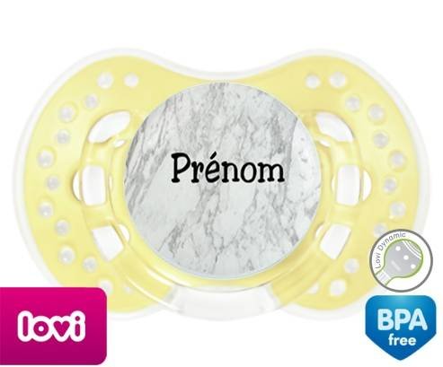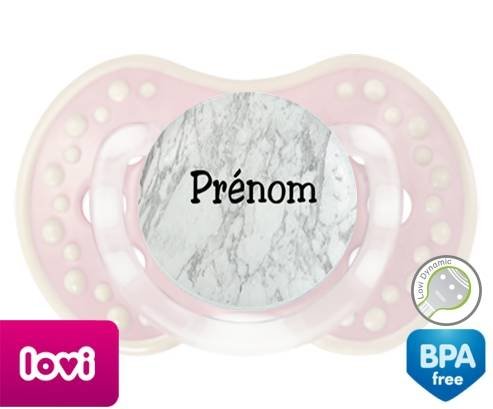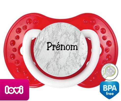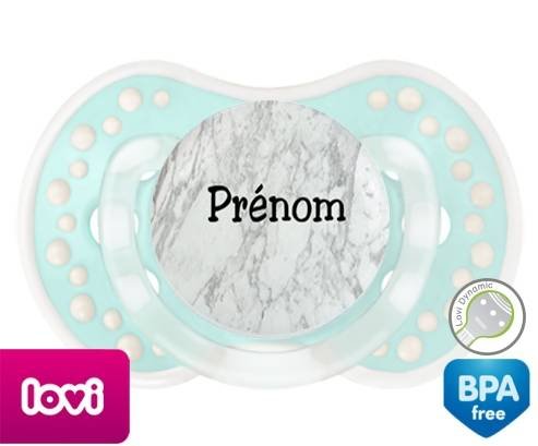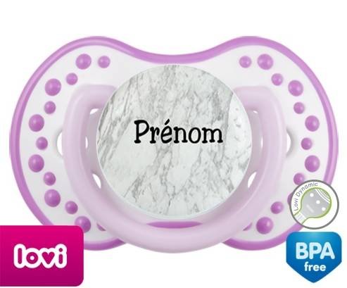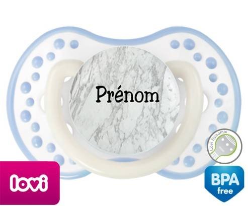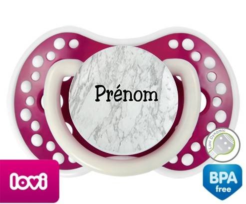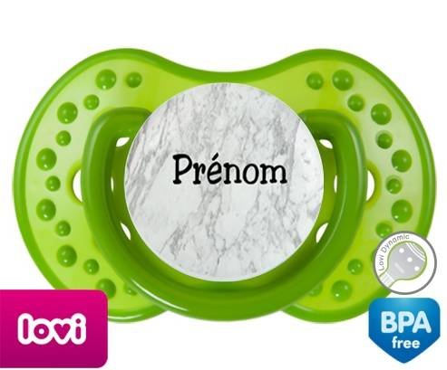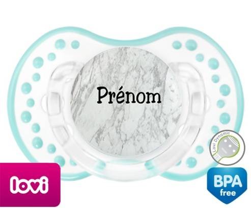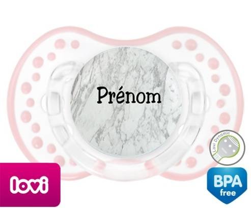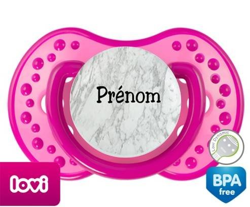 Tétine personnalisée pour bébé Motif marbre + prénom à embout LOVI Dynamic en silicone de la marque Lovi Dynamic avec impression en en Couleurs de la collection Prénom personnalisé.La silicone se reconnaît par sa couleur transparente. C'est une matière souple, douce, sans goût ni odeur et offre à bébé une succion plus facile grâce à sa souplesse.