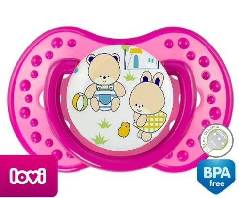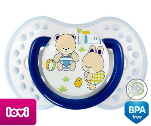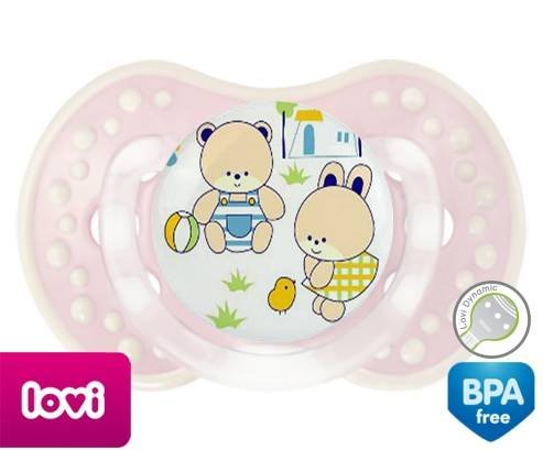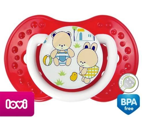 Sucette personnalisée pour bébé Nounours style1 à embout LOVI Dynamic en silicone de la marque Lovi Dynamic avec impression en en Couleurs de la collection Design / Motif.La silicone se reconnaît par sa couleur transparente. C'est une matière souple, douce, sans goût ni odeur et offre à bébé une succion plus facile grâce à sa souplesse.