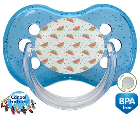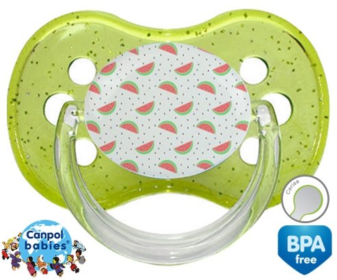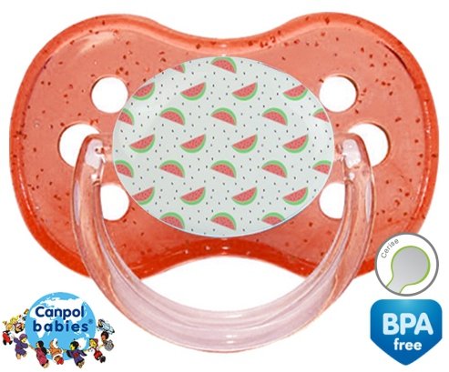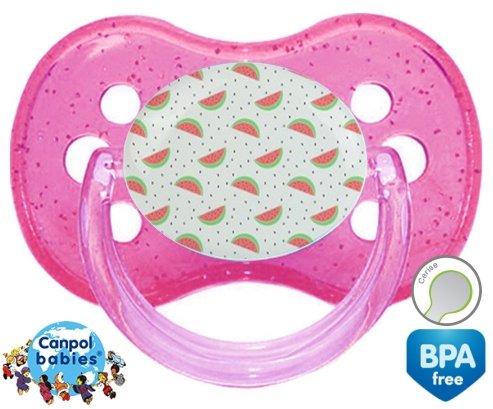 Sucette personnalisée pour bébé Pastèque à embout Cerise en silicone de la marque Canpol Babies avec impression en en Couleurs de la collection Design / Motif.La silicone se reconnaît par sa couleur transparente. C'est une matière souple, douce, sans goût ni odeur et offre à bébé une succion plus facile grâce à sa souplesse.