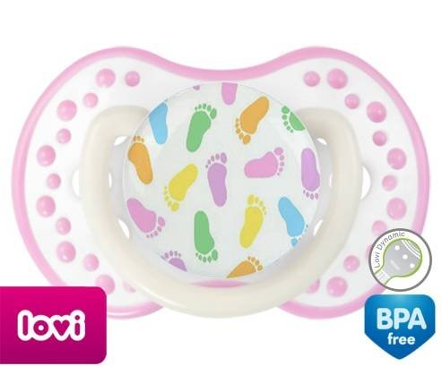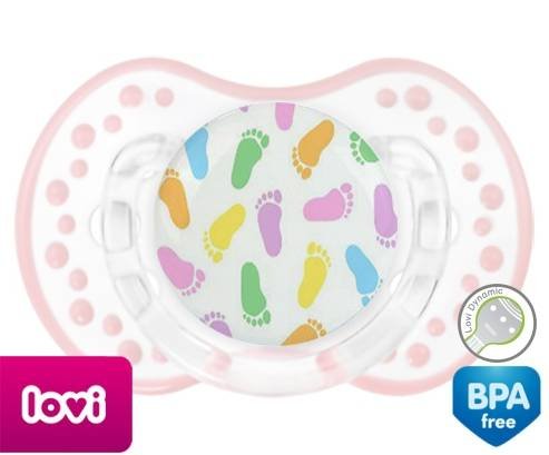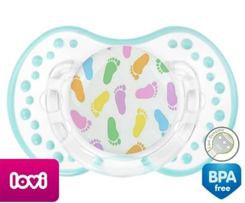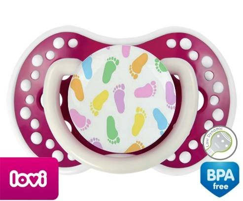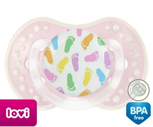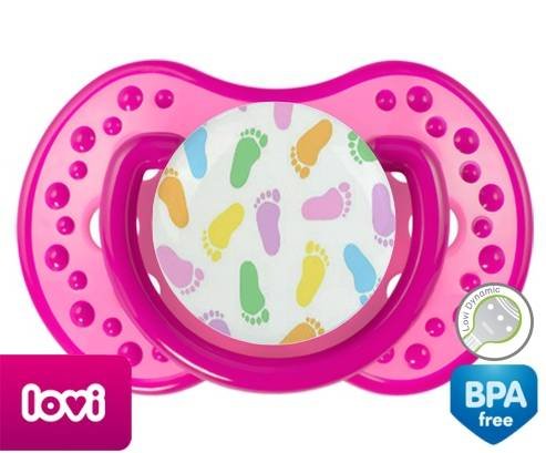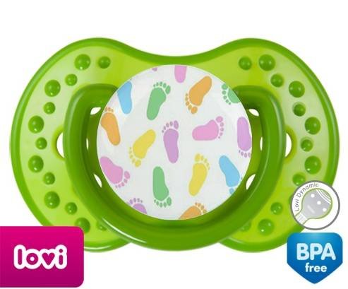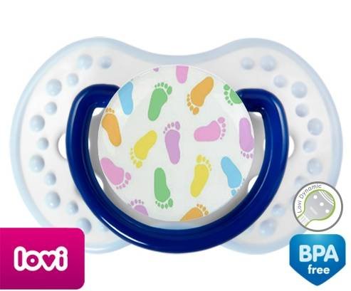 Sucette personnalisée pour bébé Pieds à embout LOVI Dynamic en silicone de la marque Lovi Dynamic avec impression en en Couleurs de la collection Design / Motif.La silicone se reconnaît par sa couleur transparente. C'est une matière souple, douce, sans goût ni odeur et offre à bébé une succion plus facile grâce à sa souplesse.