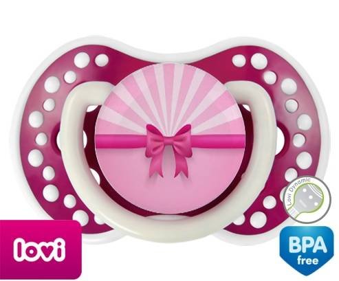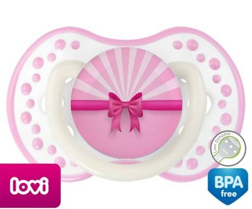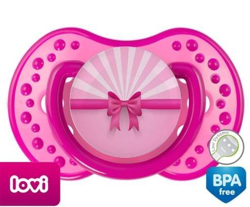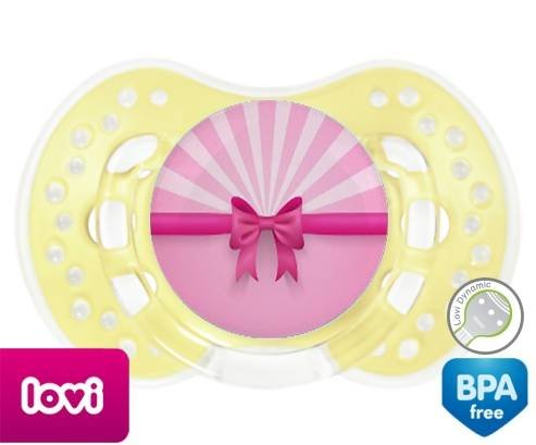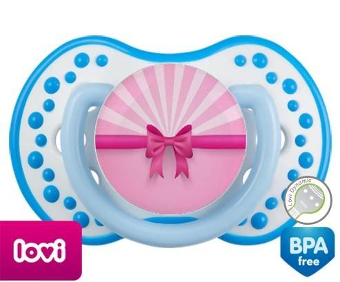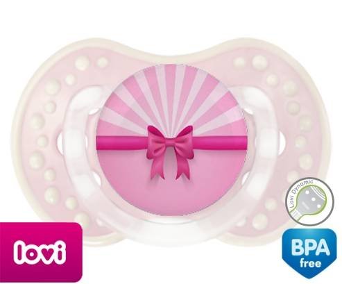 Tétine personnalisée pour bébé Princesse noeud à embout LOVI Dynamic en silicone de la marque Lovi Dynamic avec impression en en Couleurs de la collection Design / Motif.La silicone se reconnaît par sa couleur transparente. C'est une matière souple, douce, sans goût ni odeur et offre à bébé une succion plus facile grâce à sa souplesse.