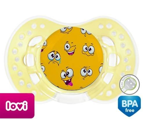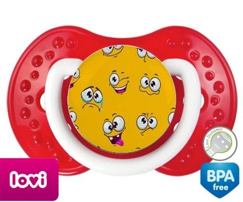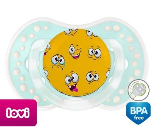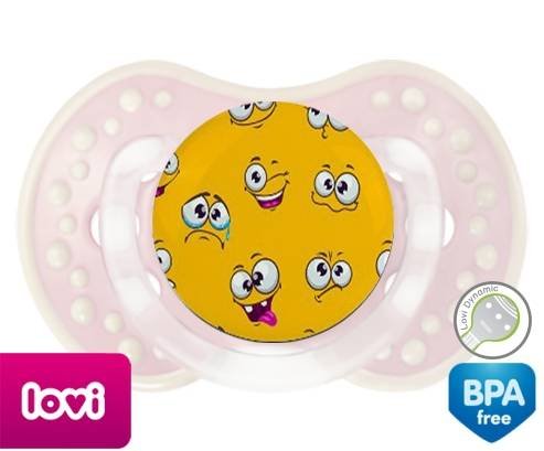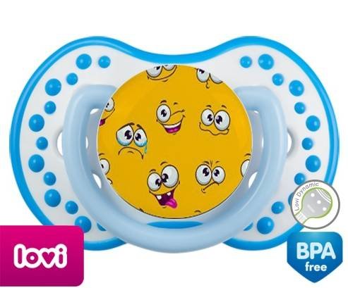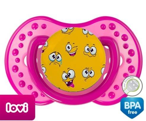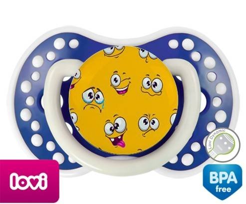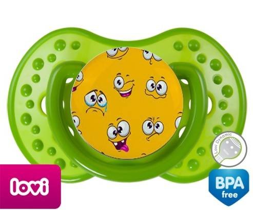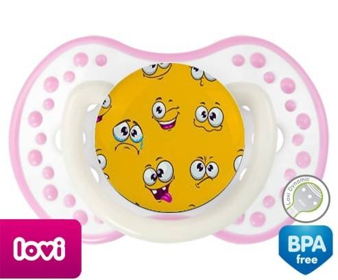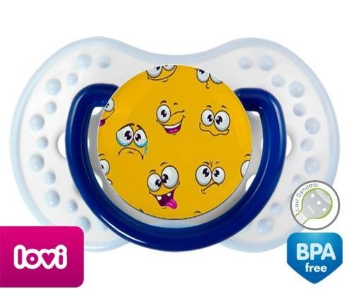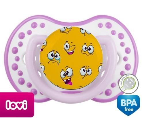 Sucette personnalisée pour bébé Smiley à embout LOVI Dynamic en silicone de la marque Lovi Dynamic avec impression en en Couleurs de la collection Design / Motif.La silicone se reconnaît par sa couleur transparente. C'est une matière souple, douce, sans goût ni odeur et offre à bébé une succion plus facile grâce à sa souplesse.