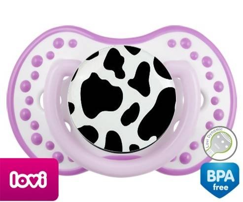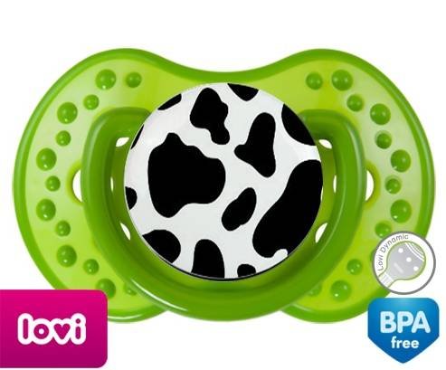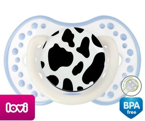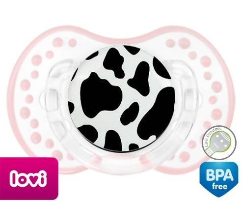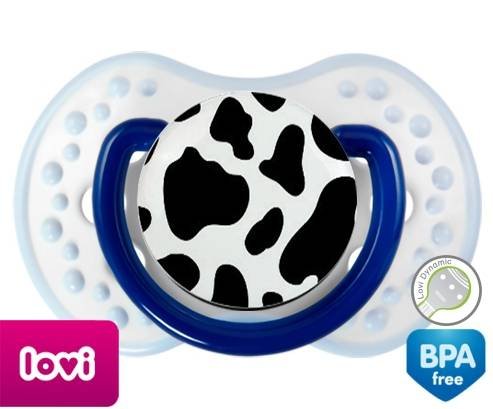 Tetine personnalisee pour bébé Vache à embout LOVI Dynamic en silicone de la marque Lovi Dynamic avec impression en en Couleurs de la collection Design / Motif.La silicone se reconnaît par sa couleur transparente. C'est une matière souple, douce, sans goût ni odeur et offre à bébé une succion plus facile grâce à sa souplesse.