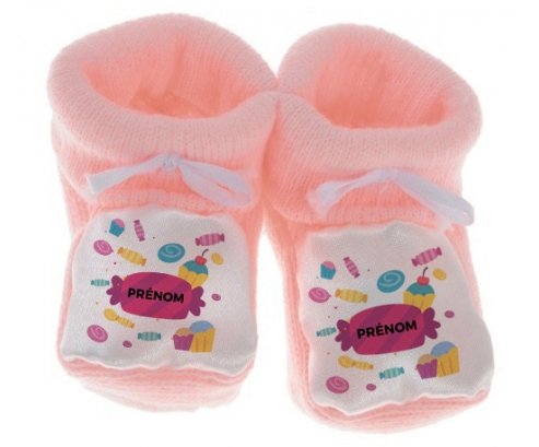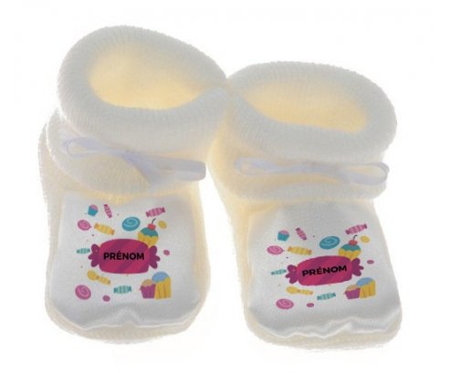 Su7.fr vous propose le chausson bébé personnalisé pour nouveau né avec le design : Bonbons anniversaire + prénom . Ce chausson avec une impression en couleur compléte toute la gamme ( sucette, attache-sucette, bavoir, chausson, body , Boîte à sucette, et bonnet).