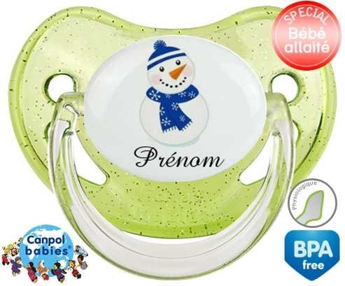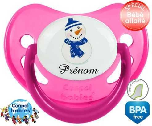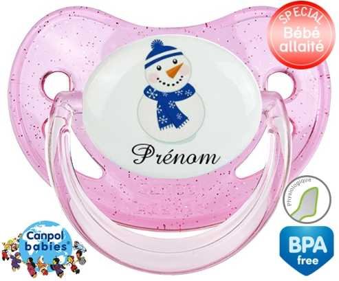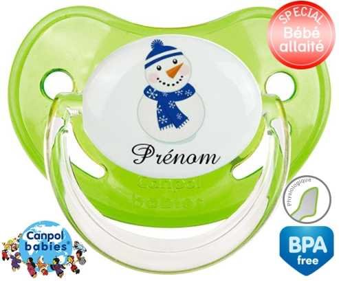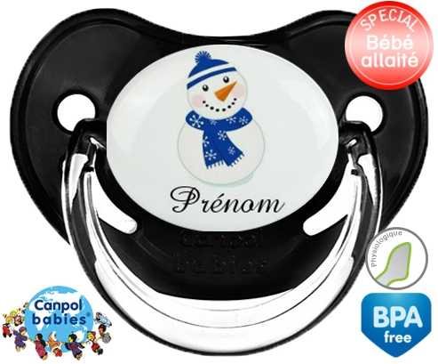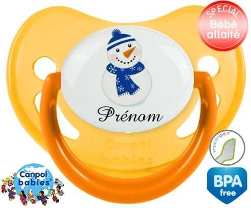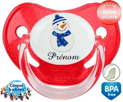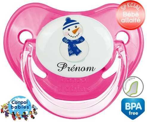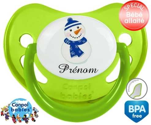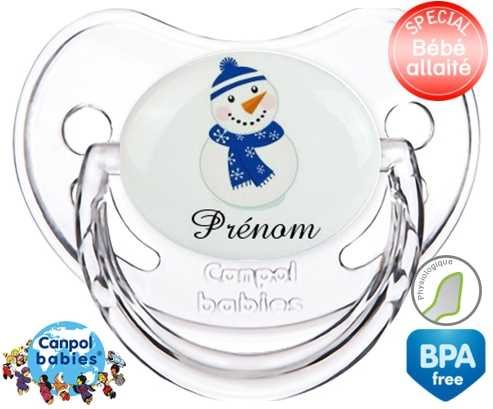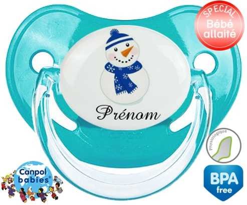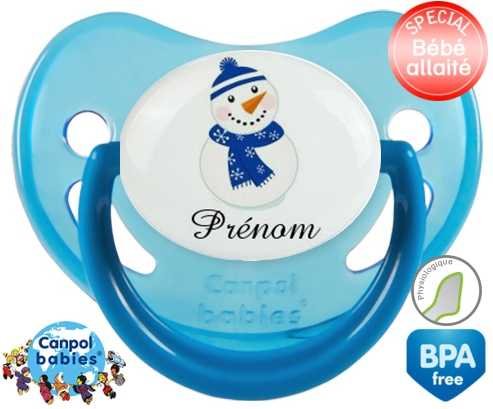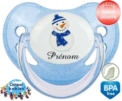 Sucette personnalisée avec le prénom pour bébé Bonhomme de neige bleu + prénom : Sucette Physiologique en silicone de la marque Canpol Babies avec impression en couleur.