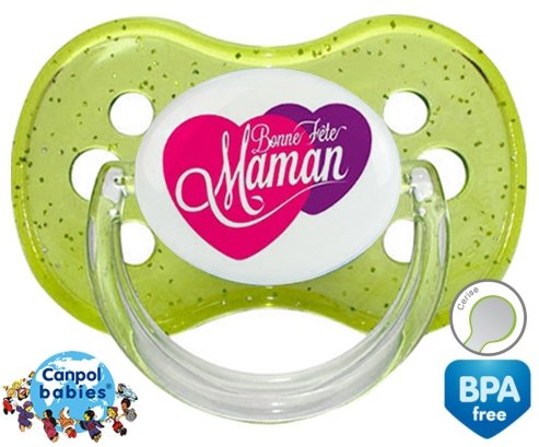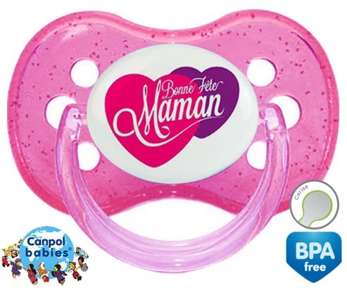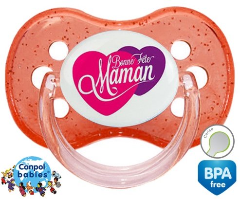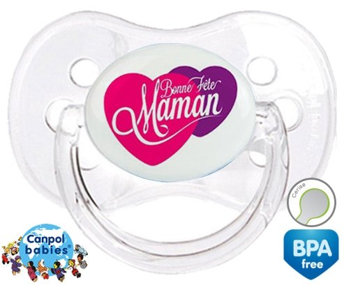 Tetine personnalisee pour bébé Bonne fête maman style10 à embout Cerise en silicone de la marque Canpol Babies avec impression en en Couleurs de la collection Fête et Événement.La silicone se reconnaît par sa couleur transparente. C'est une matière souple, douce, sans goût ni odeur et offre à bébé une succion plus facile grâce à sa souplesse.