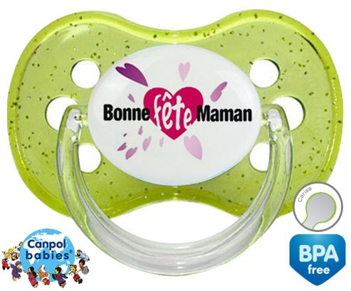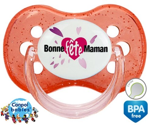 Sucette personnalisée pour bébé Bonne fête maman style13 à embout Cerise en silicone de la marque Canpol Babies avec impression en en Couleurs de la collection Fête et Événement.La silicone se reconnaît par sa couleur transparente. C'est une matière souple, douce, sans goût ni odeur et offre à bébé une succion plus facile grâce à sa souplesse.