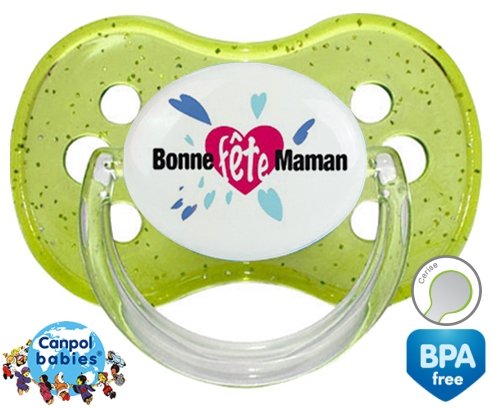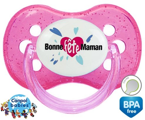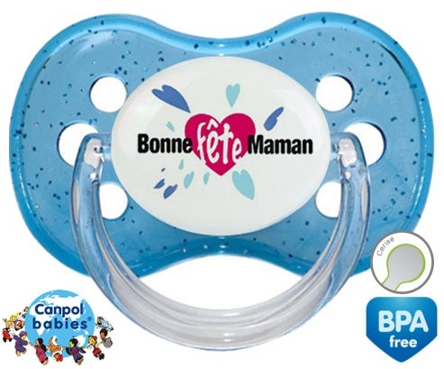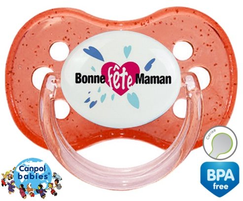 Sucette personnalisée pour bébé Bonne fête maman style16 à embout Cerise en silicone de la marque Canpol Babies avec impression en en Couleurs de la collection Fête et Événement.La silicone se reconnaît par sa couleur transparente. C'est une matière souple, douce, sans goût ni odeur et offre à bébé une succion plus facile grâce à sa souplesse.