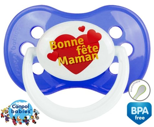 Tétine personnalisée pour bébé Bonne fête maman style2 à embout Anatomique en silicone de la marque Canpol Babies avec impression en en Couleurs de la collection Fête et Événement.La silicone se reconnaît par sa couleur transparente. C'est une matière souple, douce, sans goût ni odeur et offre à bébé une succion plus facile grâce à sa souplesse.
