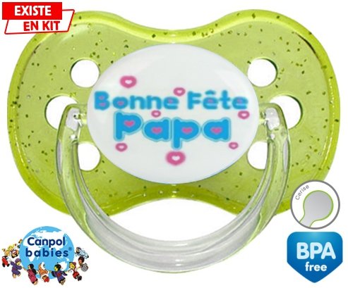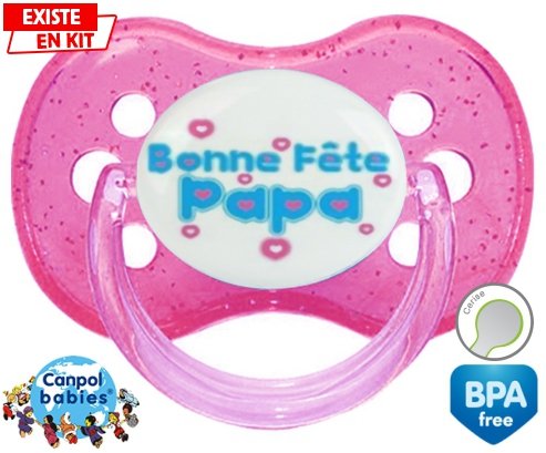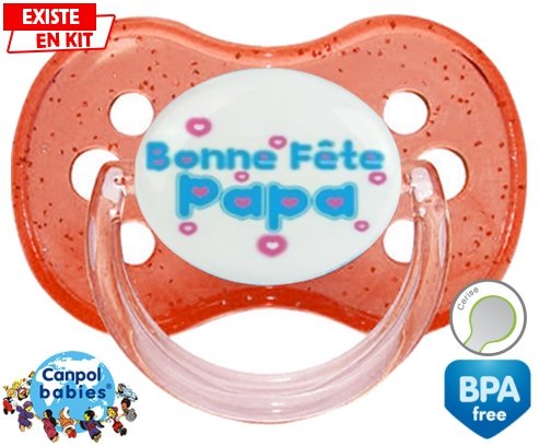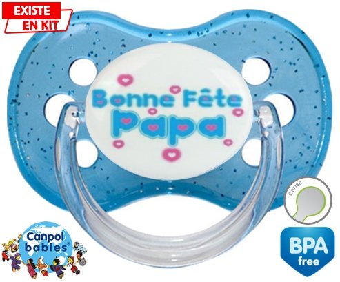 Sucette personnalisée pour bébé Bonne fête papa style1 à embout Cerise en silicone de la marque Canpol Babies avec impression en en Couleurs de la collection Fête et Événement.La silicone se reconnaît par sa couleur transparente. C'est une matière souple, douce, sans goût ni odeur et offre à bébé une succion plus facile grâce à sa souplesse.