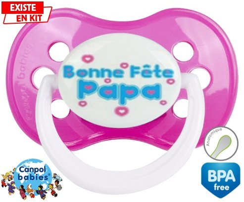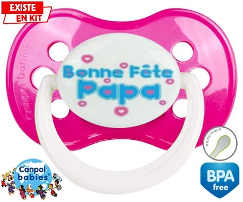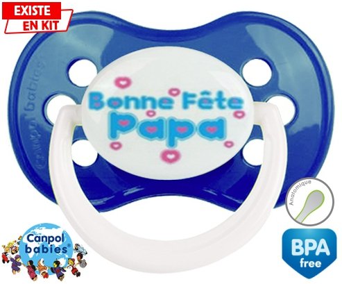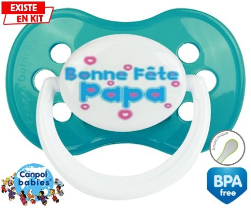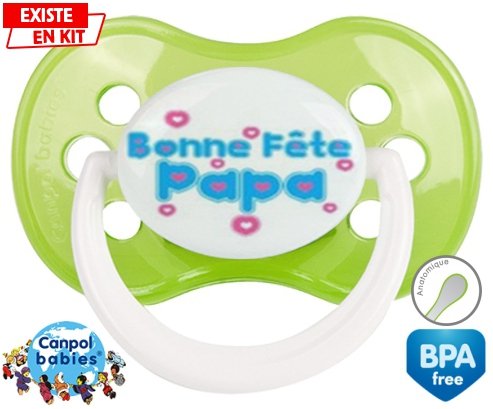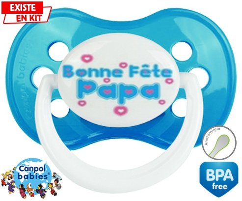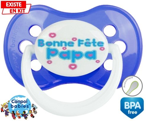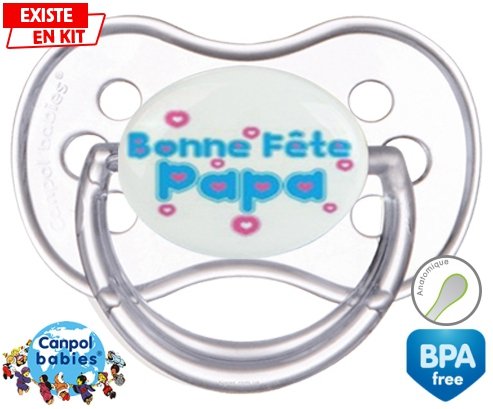 Tétine personnalisée pour bébé Bonne fête papa style1 à embout Anatomique en silicone de la marque Canpol Babies avec impression en en Couleurs de la collection Fête et Événement.La silicone se reconnaît par sa couleur transparente. C'est une matière souple, douce, sans goût ni odeur et offre à bébé une succion plus facile grâce à sa souplesse.