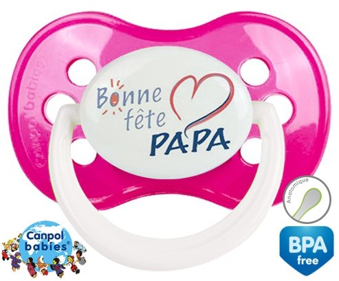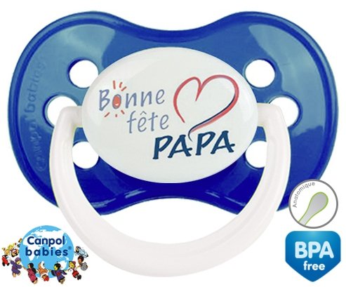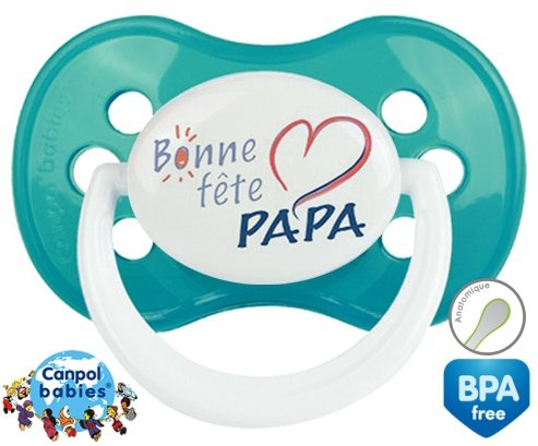 Tétine personnalisée pour bébé Bonne fête papa style9 à embout Anatomique en silicone de la marque Canpol Babies avec impression en en Couleurs de la collection Fête et Événement.La silicone se reconnaît par sa couleur transparente. C'est une matière souple, douce, sans goût ni odeur et offre à bébé une succion plus facile grâce à sa souplesse.