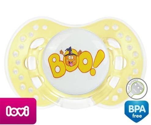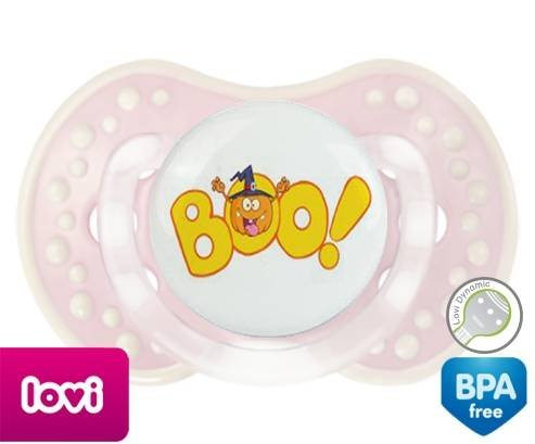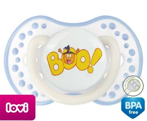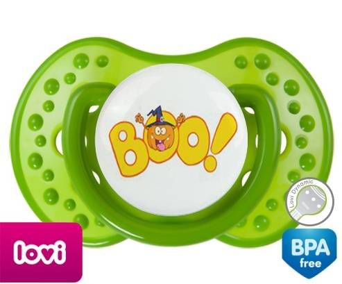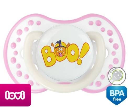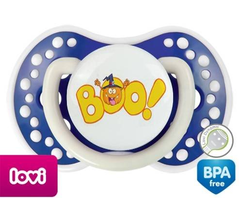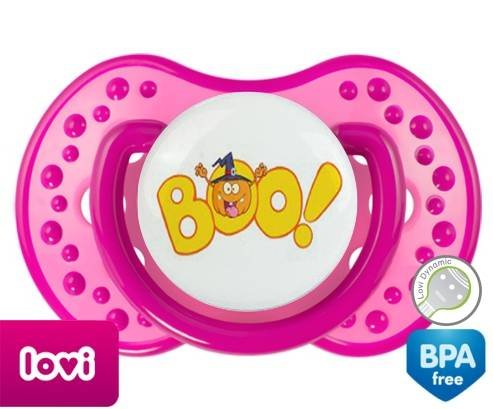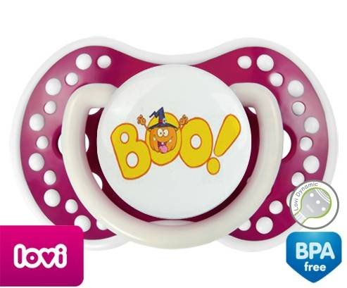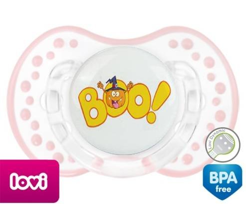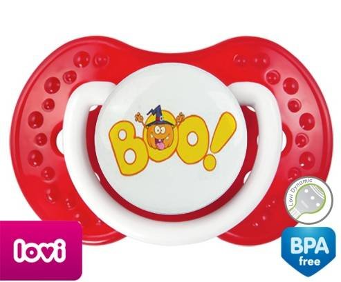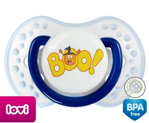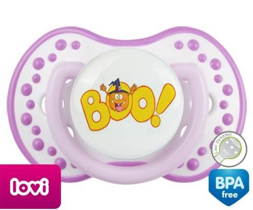 Sucette personnalisée pour bébé Boo + citrouille halloween à embout LOVI Dynamic en silicone de la marque Lovi Dynamic avec impression en en Couleurs de la collection Fête et Événement.La silicone se reconnaît par sa couleur transparente. C'est une matière souple, douce, sans goût ni odeur et offre à bébé une succion plus facile grâce à sa souplesse.