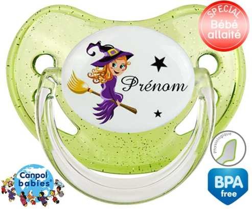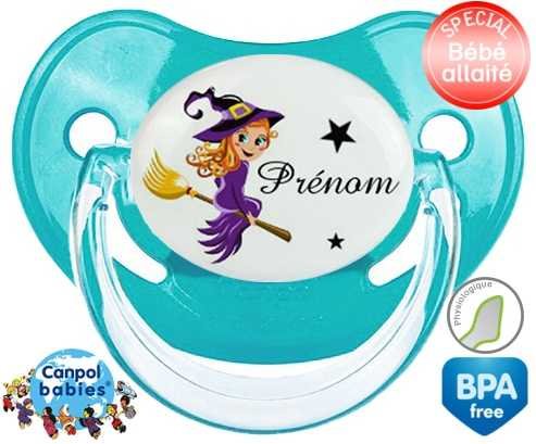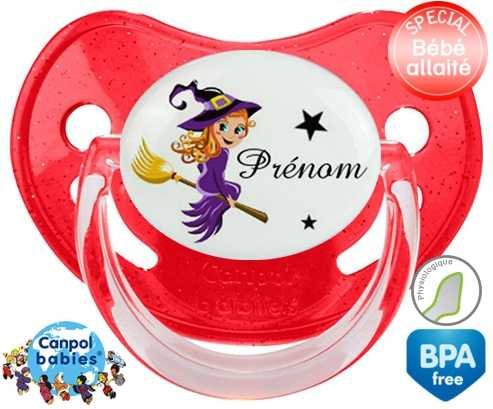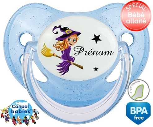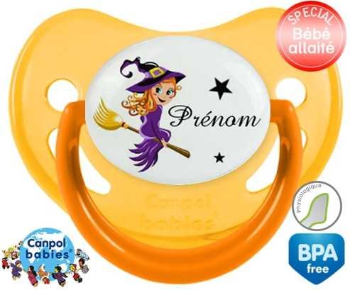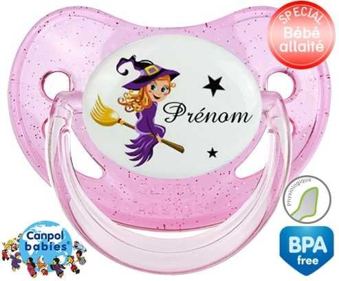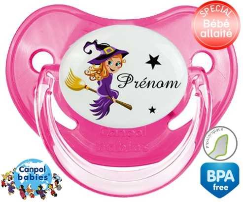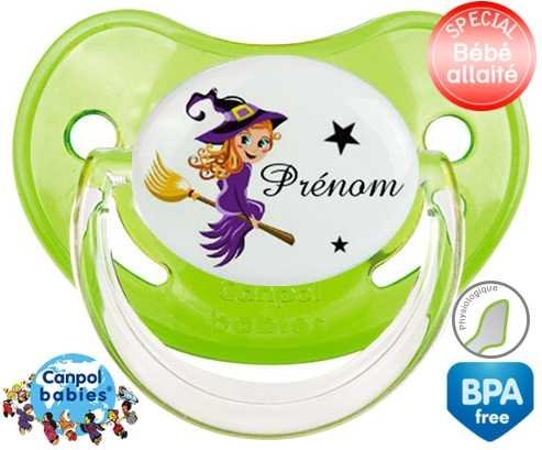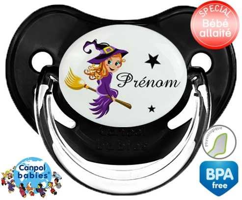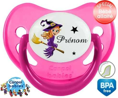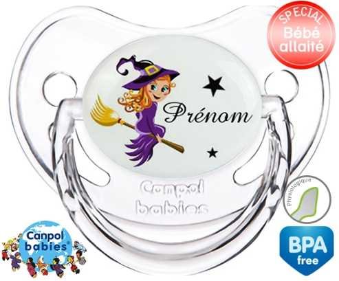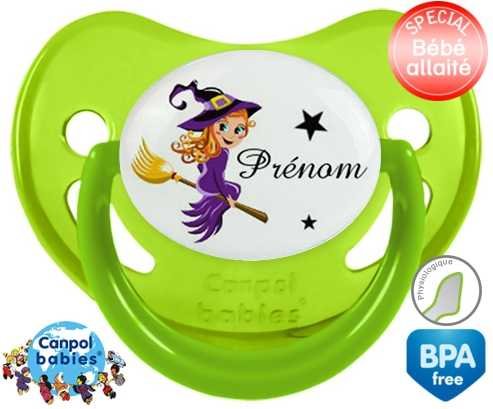 Sucette personnalisée pour bébé Sorcière + prénom à embout Physiologique en silicone de la marque Canpol Babies avec impression en en Couleurs de la collection Prénom personnalisé.La silicone se reconnaît par sa couleur transparente. C'est une matière souple, douce, sans goût ni odeur et offre à bébé une succion plus facile grâce à sa souplesse.