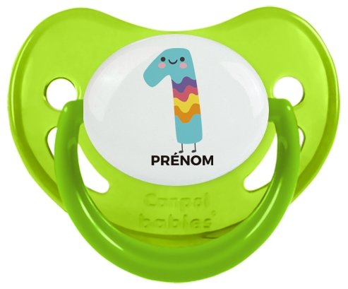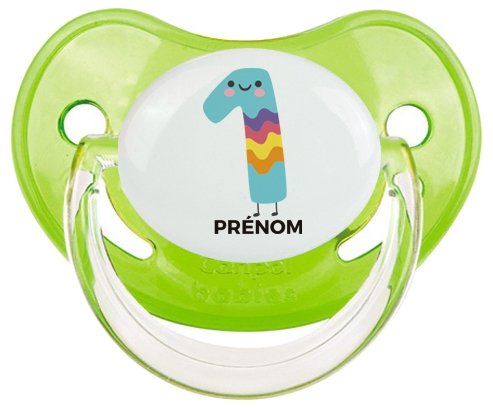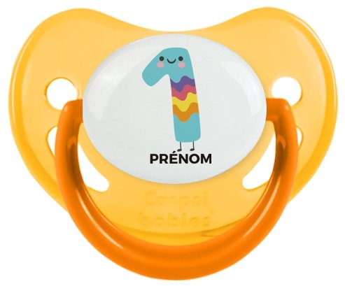 Sucette personnalisée pour bébé design : un an anniversaire style 2 + prénom : Sucette Physiologique en silicone de la marque Canpol Babies avec impression en couleur.un cadeau idéal pour vos bébés. Nos sucettes sont conçues avec l'aide de pédiatres et de dentistes pour respecter la physiologie de bébé et répondre à son réflexe naturel de succion.