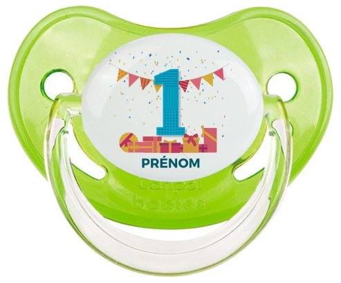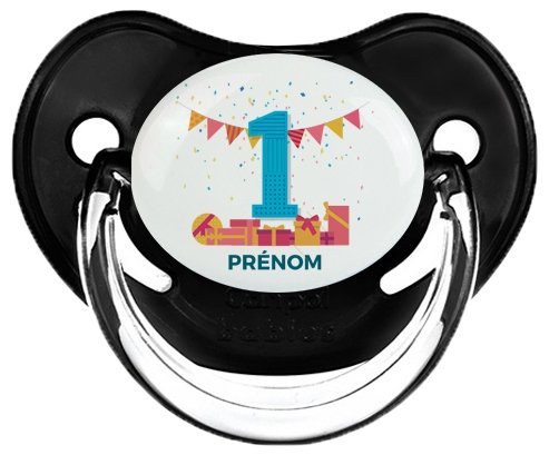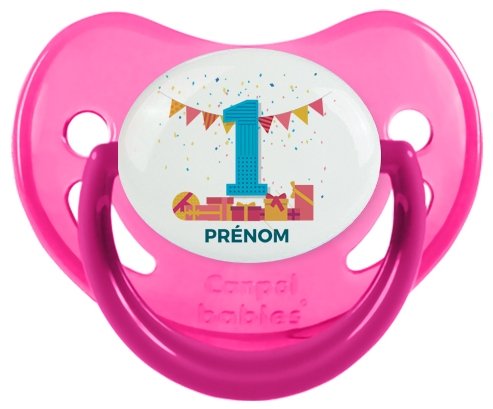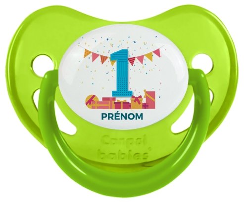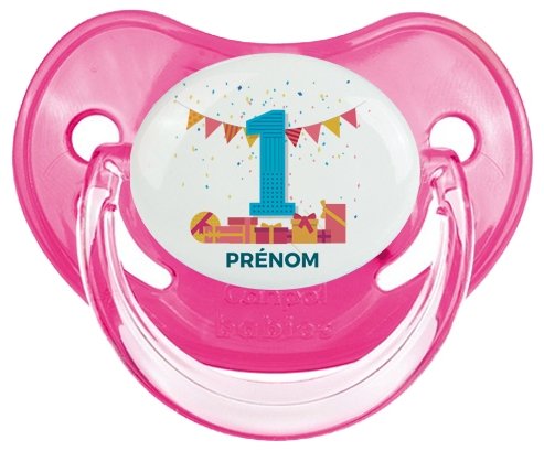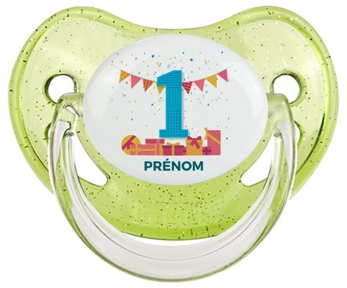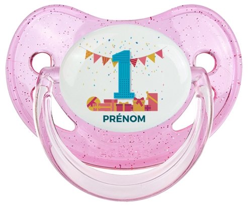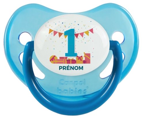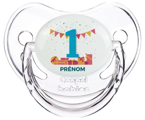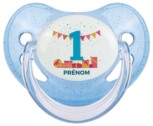 Pourquoi choisir : Tetine un an anniversaire style 6 + prénom embout Physiologique