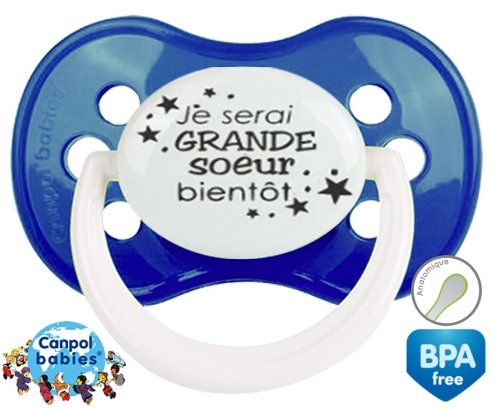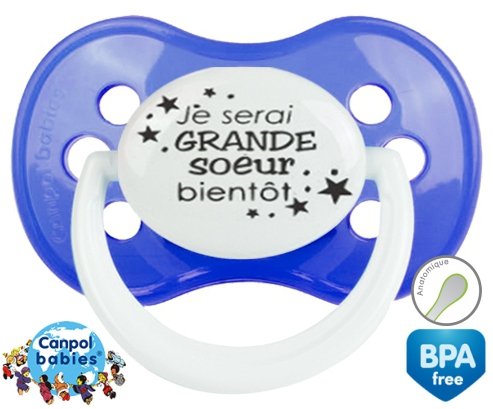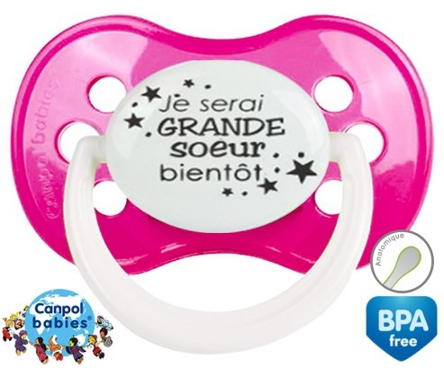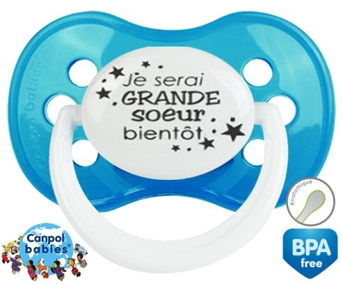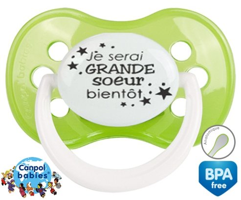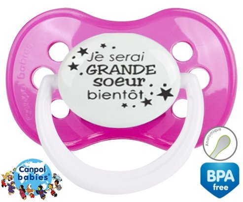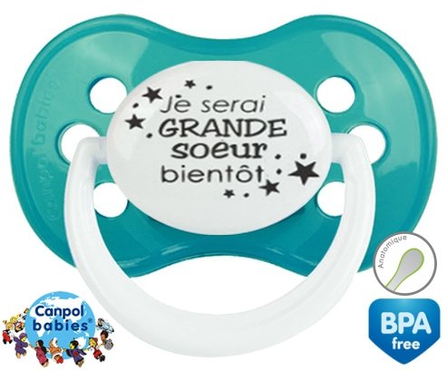 Sucette personnalisée pour bébé Je serai grande soeur bientôt : Sucette Anatomique en silicone de la marque Canpol Babies avec impression en gris.