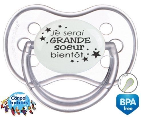 Sucette personnalisée pour bébé Je serai grande soeur bientôt à embout Anatomique en silicone de la marque Canpol Babies avec impression en en Gris de la collection Frère / Sœur.La silicone se reconnaît par sa couleur transparente. C'est une matière souple, douce, sans goût ni odeur et offre à bébé une succion plus facile grâce à sa souplesse.