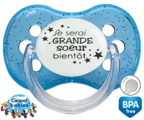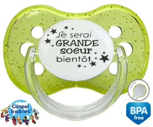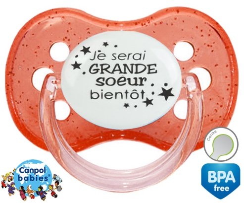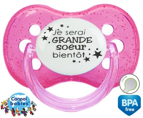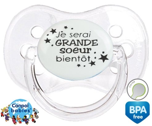 Tetine personnalisee pour bébé Je serai grande soeur bientôt à embout Cerise en silicone de la marque Canpol Babies avec impression en en Gris de la collection Frère / Sœur.La silicone se reconnaît par sa couleur transparente. C'est une matière souple, douce, sans goût ni odeur et offre à bébé une succion plus facile grâce à sa souplesse.