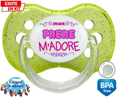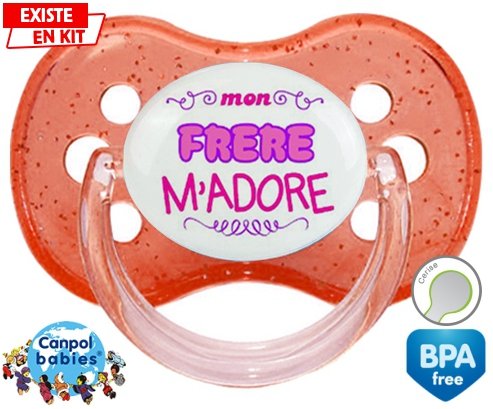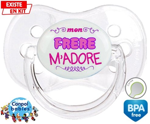 Tetine personnalisee pour bébé Mon frère m'adore (fille) à embout Cerise en silicone de la marque Canpol Babies avec impression en en Couleurs de la collection j'aime / j'adore.La silicone se reconnaît par sa couleur transparente. C'est une matière souple, douce, sans goût ni odeur et offre à bébé une succion plus facile grâce à sa souplesse.
