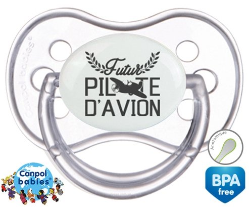 Tetine personnalisee pour bébé Futur pilote d'avion style1 à embout Anatomique en silicone de la marque Canpol Babies avec impression en en Gris de la collection Futur / Future.La silicone se reconnaît par sa couleur transparente. C'est une matière souple, douce, sans goût ni odeur et offre à bébé une succion plus facile grâce à sa souplesse.