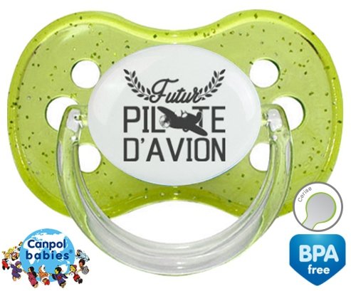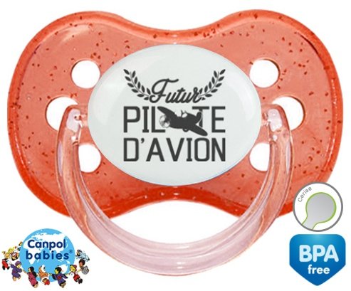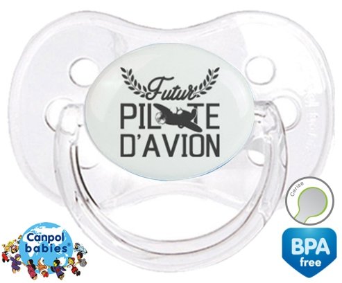 Sucette personnalisée pour bébé Futur pilote d'avion style1 à embout Cerise en silicone de la marque Canpol Babies avec impression en en Gris de la collection Futur / Future.La silicone se reconnaît par sa couleur transparente. C'est une matière souple, douce, sans goût ni odeur et offre à bébé une succion plus facile grâce à sa souplesse.