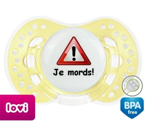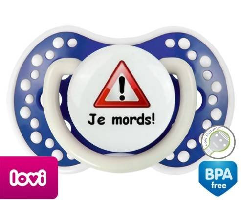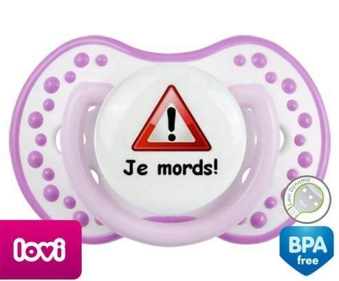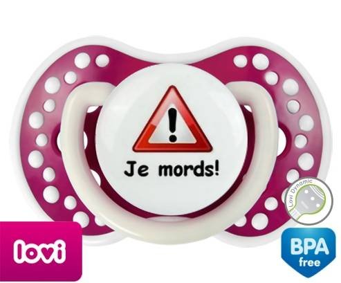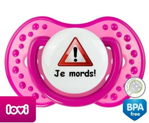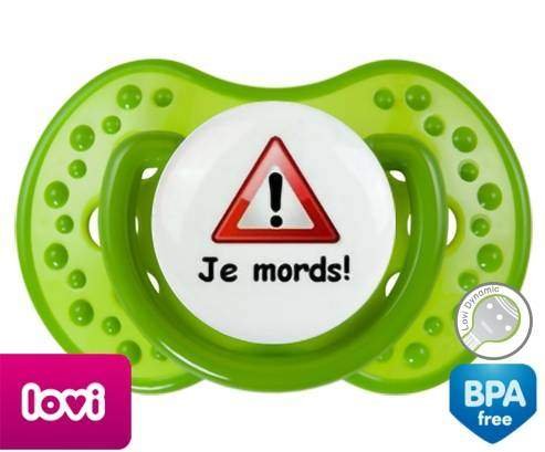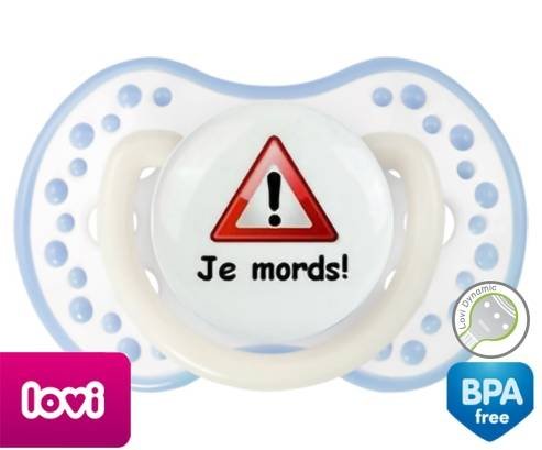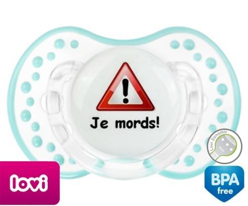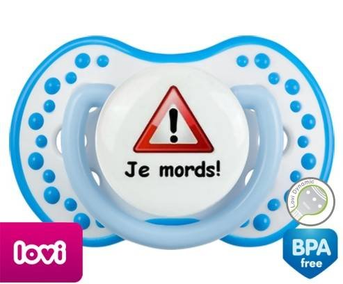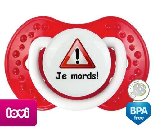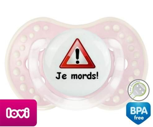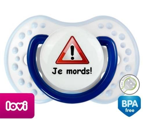Sucette personnalisée pour bébé Attention je mords à embout LOVI Dynamic en silicone de la marque Lovi Dynamic avec impression en en Couleurs de la collection Message.La silicone se reconnaît par sa couleur transparente. C'est une matière souple, douce, sans goût ni odeur et offre à bébé une succion plus facile grâce à sa souplesse.
