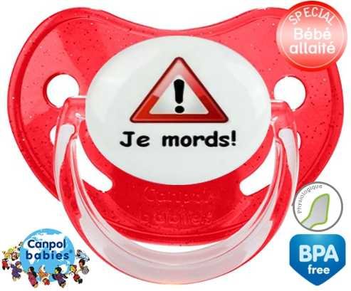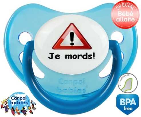 Tétine personnalisée pour bébé Attention je mords à embout Physiologique en silicone de la marque Canpol Babies avec impression en en Couleurs de la collection Message.La silicone se reconnaît par sa couleur transparente. C'est une matière souple, douce, sans goût ni odeur et offre à bébé une succion plus facile grâce à sa souplesse.