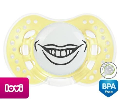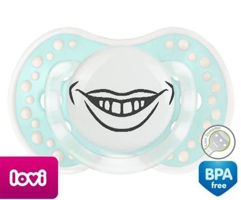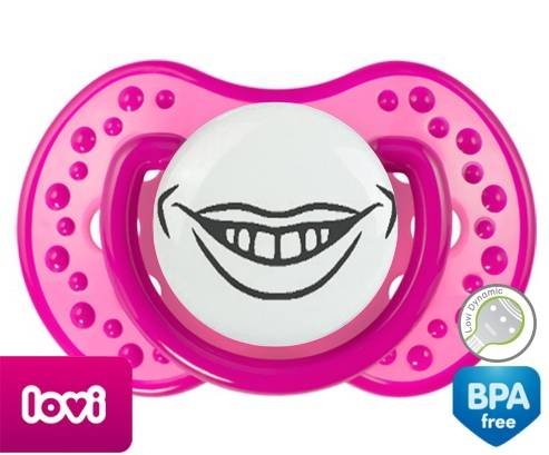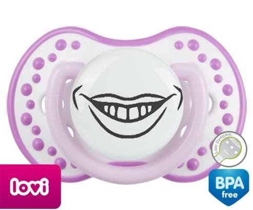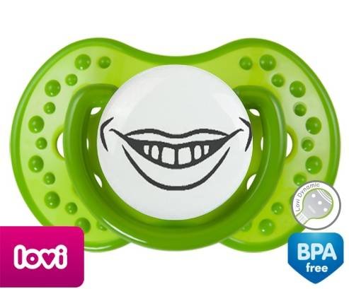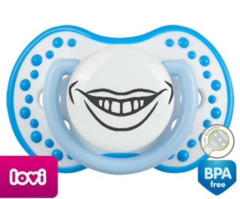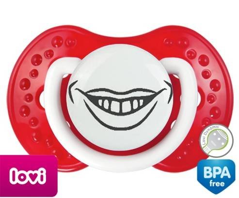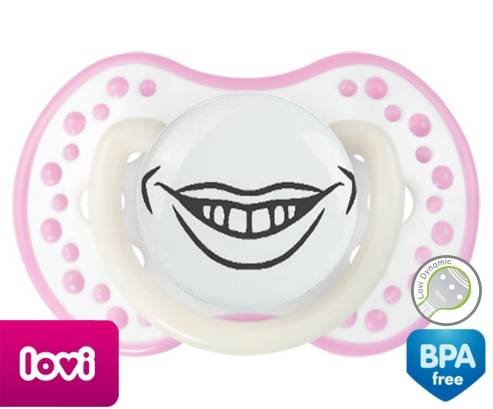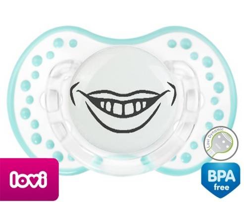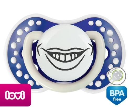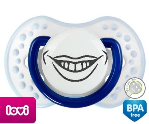 Sucette personnalisée pour bébé Bouche souriante à embout LOVI Dynamic en silicone de la marque Lovi Dynamic avec impression en en Gris de la collection Humour 4 Saisons.La silicone se reconnaît par sa couleur transparente. C'est une matière souple, douce, sans goût ni odeur et offre à bébé une succion plus facile grâce à sa souplesse.
