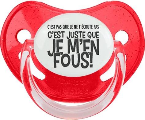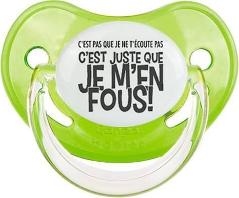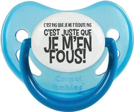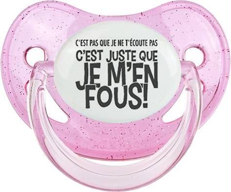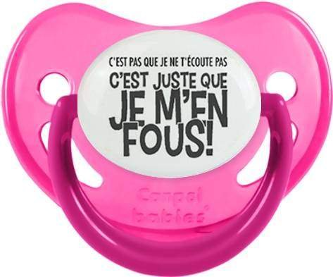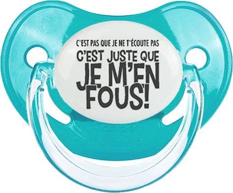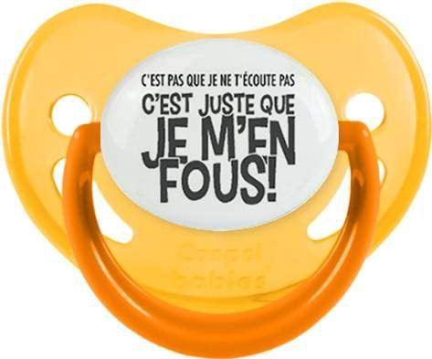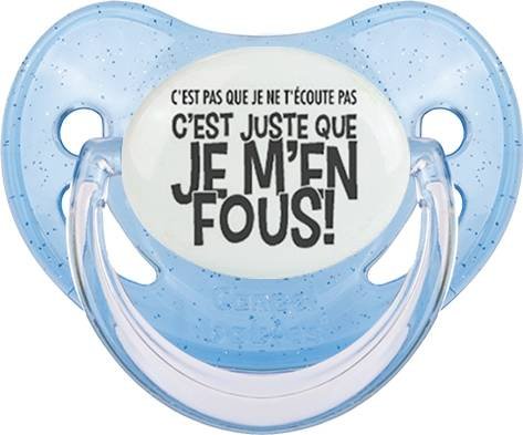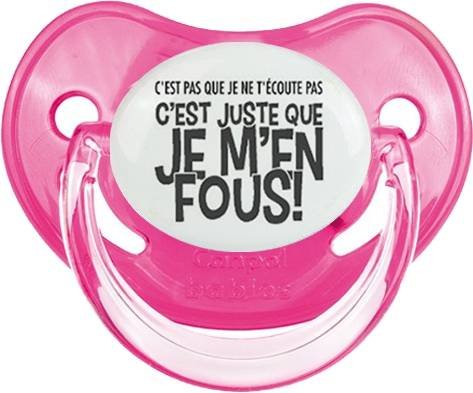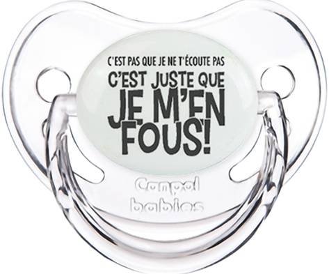 Sucette personnalisée pour bébé C'est pas que je t'écoute pas c'est juste que je m'en fous à embout Physiologique en silicone de la marque Canpol Babies avec impression en en Gris de la collection Humour 4 Saisons.La silicone se reconnaît par sa couleur transparente. C'est une matière souple, douce, sans goût ni odeur et offre à bébé une succion plus facile grâce à sa souplesse.