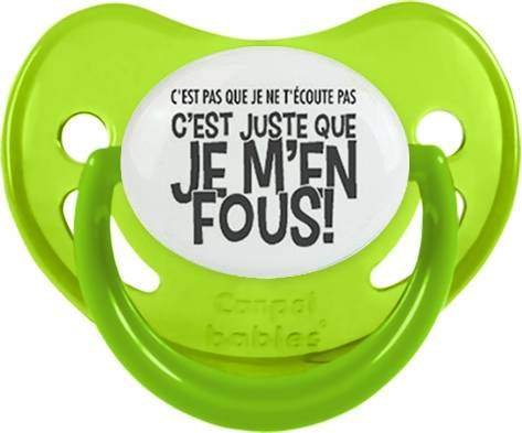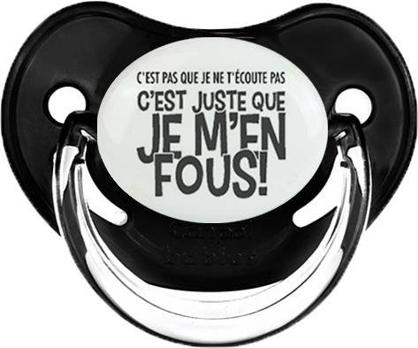 Sucette personnalisée pour bébé C'est pas que je t'écoute pas c'est juste que je m'en fous : Sucette Physiologiqueen silicone de la marque Canpol Babies avec impression en Gris.